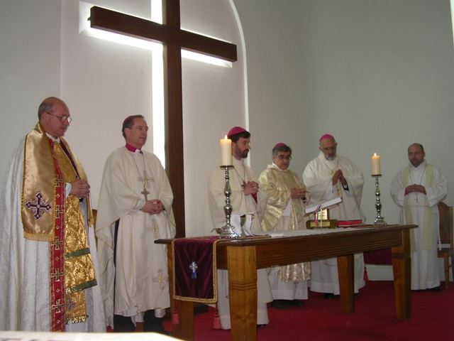 Concelebração Eucaristica em Lisboa, sob a presidência de S.B. Mons. Dom Paulo Jorge de Laureano (Mar Alexander I da Hispânea), por ocasião da visita de S.E.R. Mons. Alfredo Mingolla-Montrezza (Mar Valerian de Silio), Arcebispo de Buenos Aires, Argentina, da Igreja Ortodoxa Bielorrussa Eslava (Patriarcado Ortodoxo Bielorrusso Eslavo). Legenda da foto: S.E.R. Mons. Alfredo (esqª), S.E.R. Dom Delberto Araújo de Aguiar, S.B. Mons. Dom Paulo, S.E.R. Dom Luis Reis Golçalves, Sr. Fernão Gomes, e Mons. Álvaro Duarte