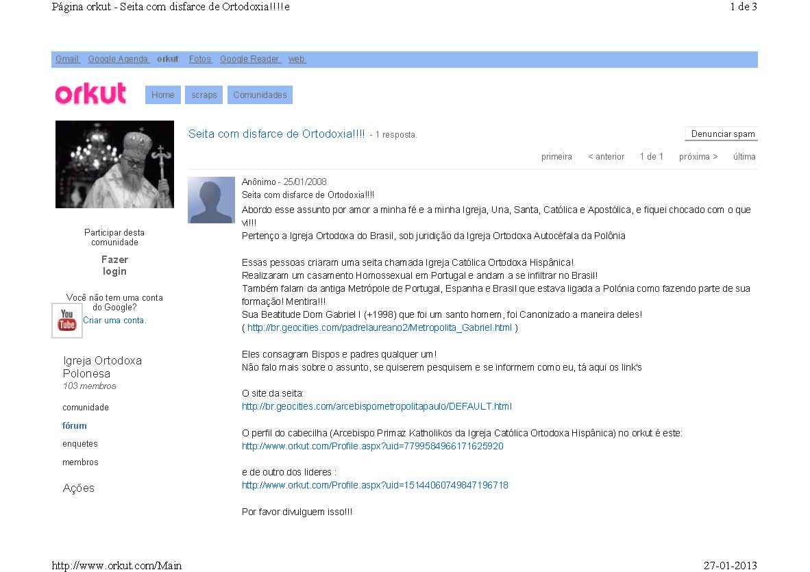 O perfil do cabecilha (Arcebispo Primaz Katholikos da Igreja Católica Ortodoxa Hispânica) no orkut é este: