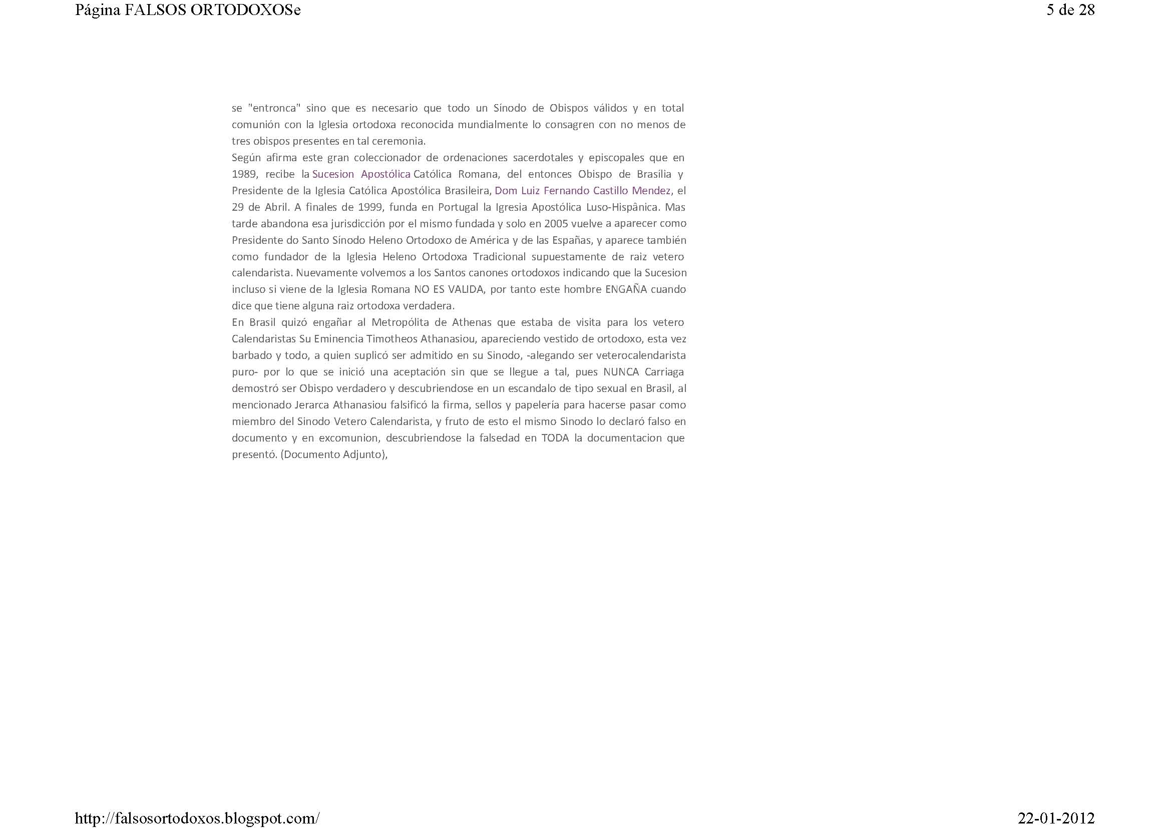 En Brasil quizó engañar al Metropólita de Athenas que estaba de visita para los vetero Calendaristas Su Eminencia Timotheos Athanasiou, apareciendo vestido de ortodoxo, esta vez barbado y todo, a quien suplicó ser admitido en su Sinodo, -alegando ser veterocalendarista puro- por lo que se inició una aceptación sin que se llegue a tal, pues NUNCA Carriaga demostró ser Obispo verdadero y descubriendose en un escandalo de tipo sexual en Brasil, al mencionado Jerarca Athanasiou falsificó la firma, sellos y papelería para hacerse pasar como miembro del Sinodo Vetero Calendarista, y fruto de esto el mismo Sinodo lo declaró falso en documento y en excomunion, descubriendose la falsedad en TODA la documentacion que presentó. (Documento Adjunto),
