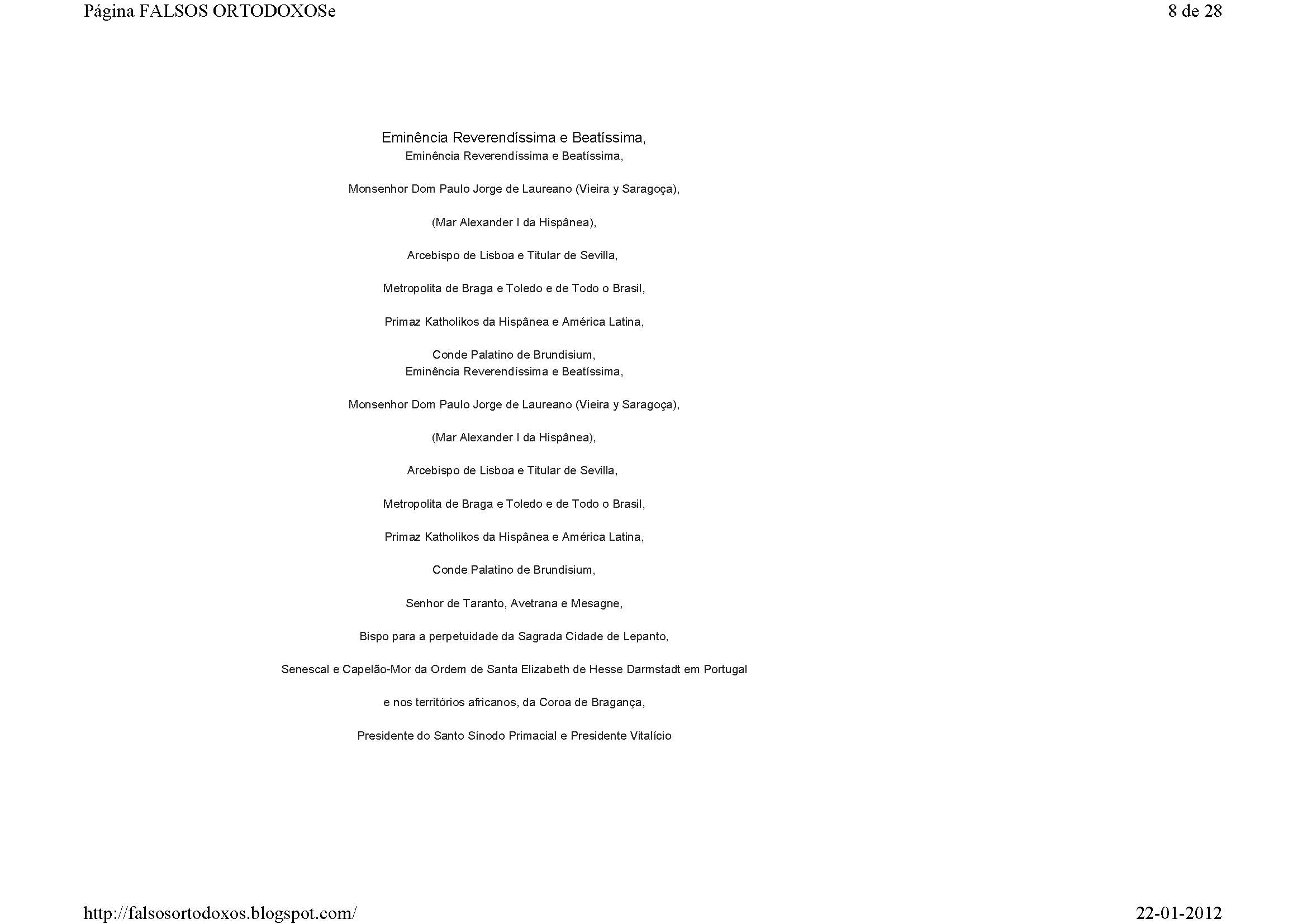 Según afirma este gran coleccionador de ordenaciones sacerdotales y episcopales que en 1989, recibe la Sucesion Apostólica Católica Romana, del entonces Obispo de Brasília y Presidente de la Iglesia Católica Apostólica Brasileira, Dom Luiz Fernando Castillo Mendez, el 29 de Abril. A finales de 1999, funda en Portugal la Igresia Apostólica Luso-Hispânica. Mas tarde abandona esa jurisdicción por el mismo fundada y solo en 2005 vuelve a aparecer como Presidente do Santo Sínodo Heleno Ortodoxo de América y de las Españas, y aparece también como fundador de la Iglesia Heleno Ortodoxa Tradicional supuestamente de raiz vetero calendarista. Nuevamente volvemos a los Santos canones ortodoxos indicando que la Sucesion incluso si viene de la Iglesia Romana NO ES VALIDA, por tanto este hombre ENGAÑA cuando dice que tiene alguna raiz ortodoxa verdadera.