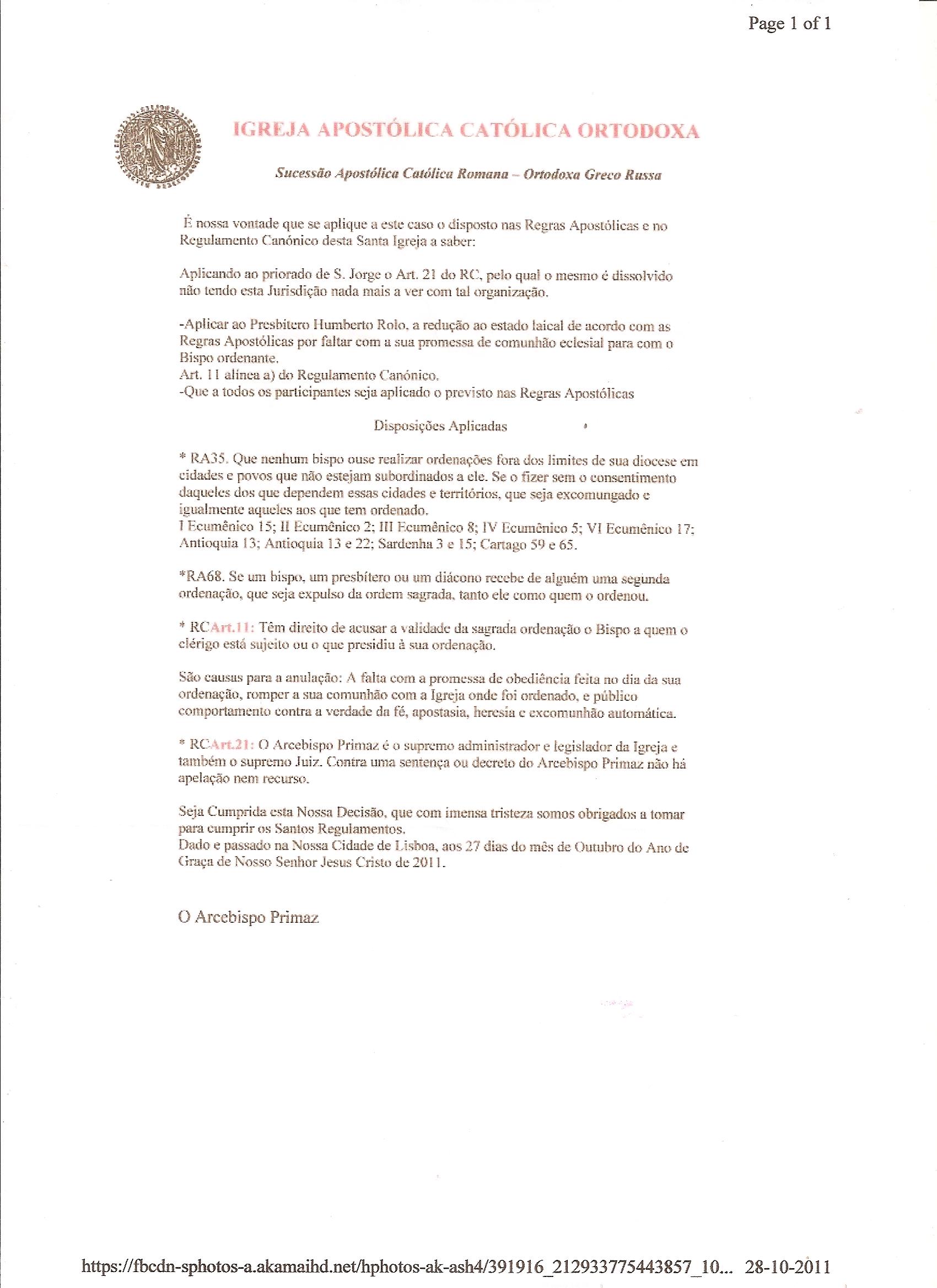 Texto da pseudo excomunhão do padre Humberto Rolo e dos bispos que o ordenaram, publicado no facebook