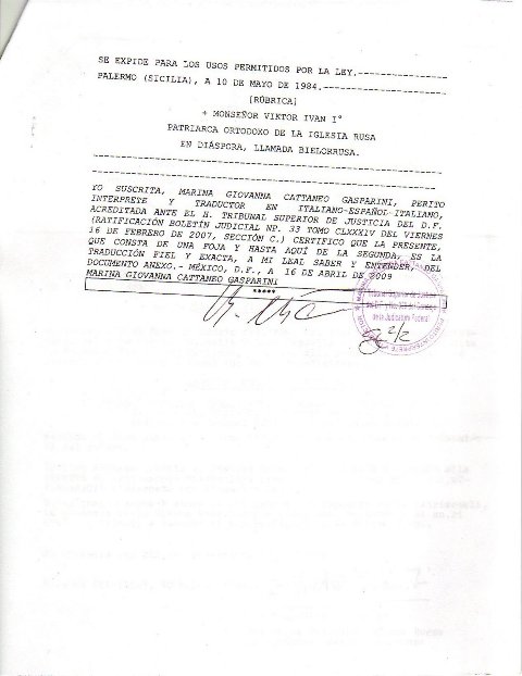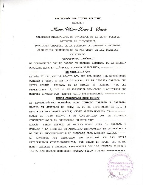 Bula da Sagração Episcopal de S.B. Juan Cariaga, recebida das mãos de S.S. Viktor Ivan Busa
