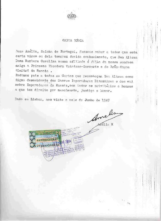Dona Amélia, Rainha de Portugal, fazemos saber a todos que esta carta virem ou dela tomarem conhecimento, que Sua Alteza Dona Barbara Carolina nossa afilhada é filha de nossa saudosa amiga a Princesa Theodora Vatatzes-Lascaris e do Grão-Duque Dimitri da Russia .