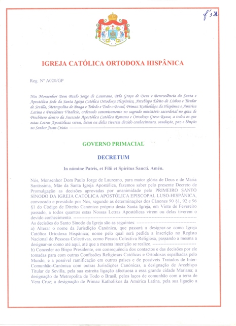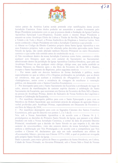 “Não reconhecer dentro da nossa Jurisdição Canónica como lícito, canónico e válido qualquer acto litúrgico, quer seja com carácter de Sacramento ou Sacramental, administrado dentro da jurisdição da Igreja Apostólica Católica Ortodoxa, quer pelo seu Arcebispo Primaz ou por qualquer outro clérigo, clérigo esse, que tenha recebido as Ordens Menores ou Maiores após o dia Dois de Fevereiro de Dois Mil e Quatro, excepto o Santo Sacramento do Baptismo, pelos seguintes motivos: