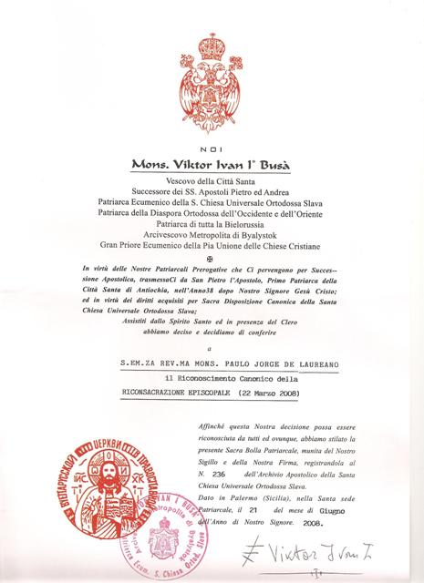 Bula de Reconhecimento Canónico da Re-Consagração Episcopal de S.B. Dom Paulo Laureano