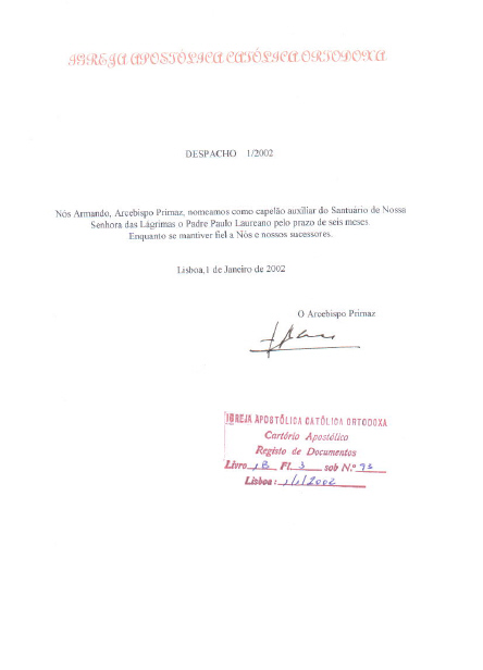Despacho como Capelão Auxiliar do Santuário de Nossa Senhora das Lágrimas