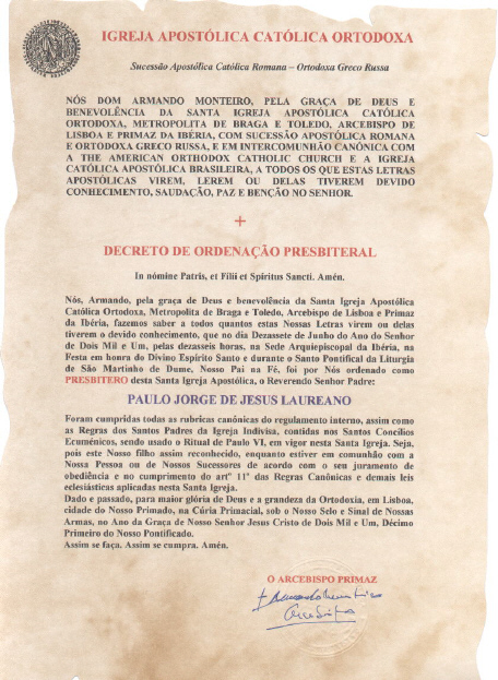 Decreto da Ordenação Presbiteral de S.B. Dom Paulo Laureano na Igreja Apostólica Católica Ortodoxa