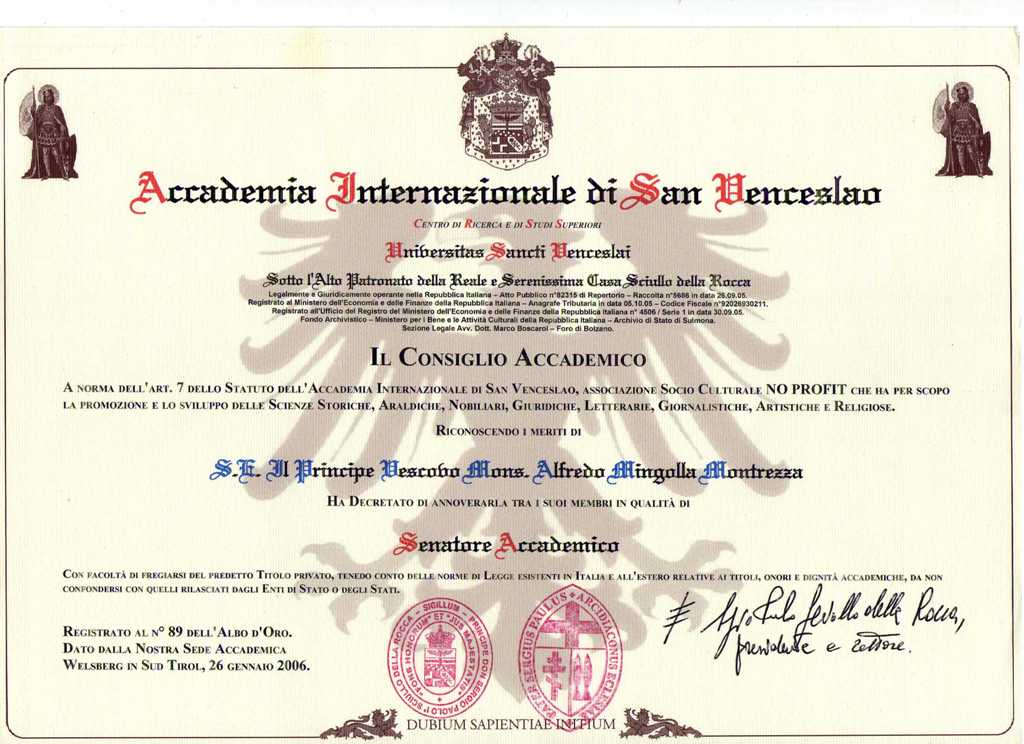 Documento em que S.E.R. Dom Alfredo Mingolla-Montrezza, é nomeado Senatore Accademico pela Accademia Internazionale di San Vescelao