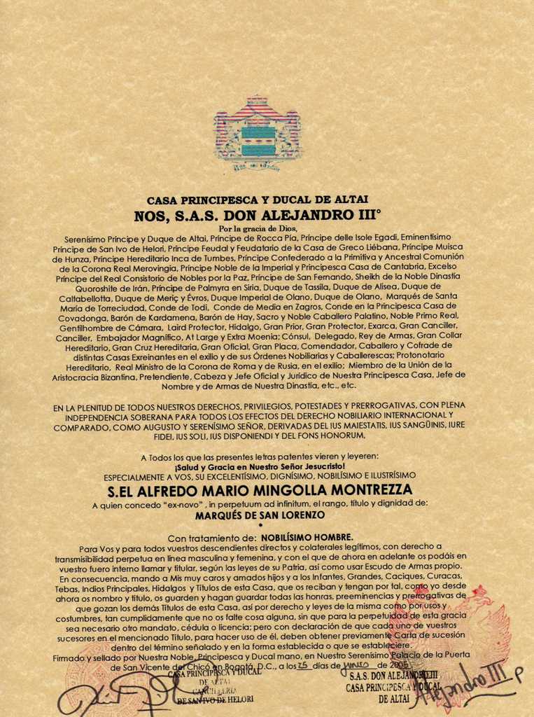 Documento em que S.E.R. Dom Alfredo Mingolla-Montrezza, é nomeado Marqués de San Lorenzo pela Casa Principesca y Ducal de Altai