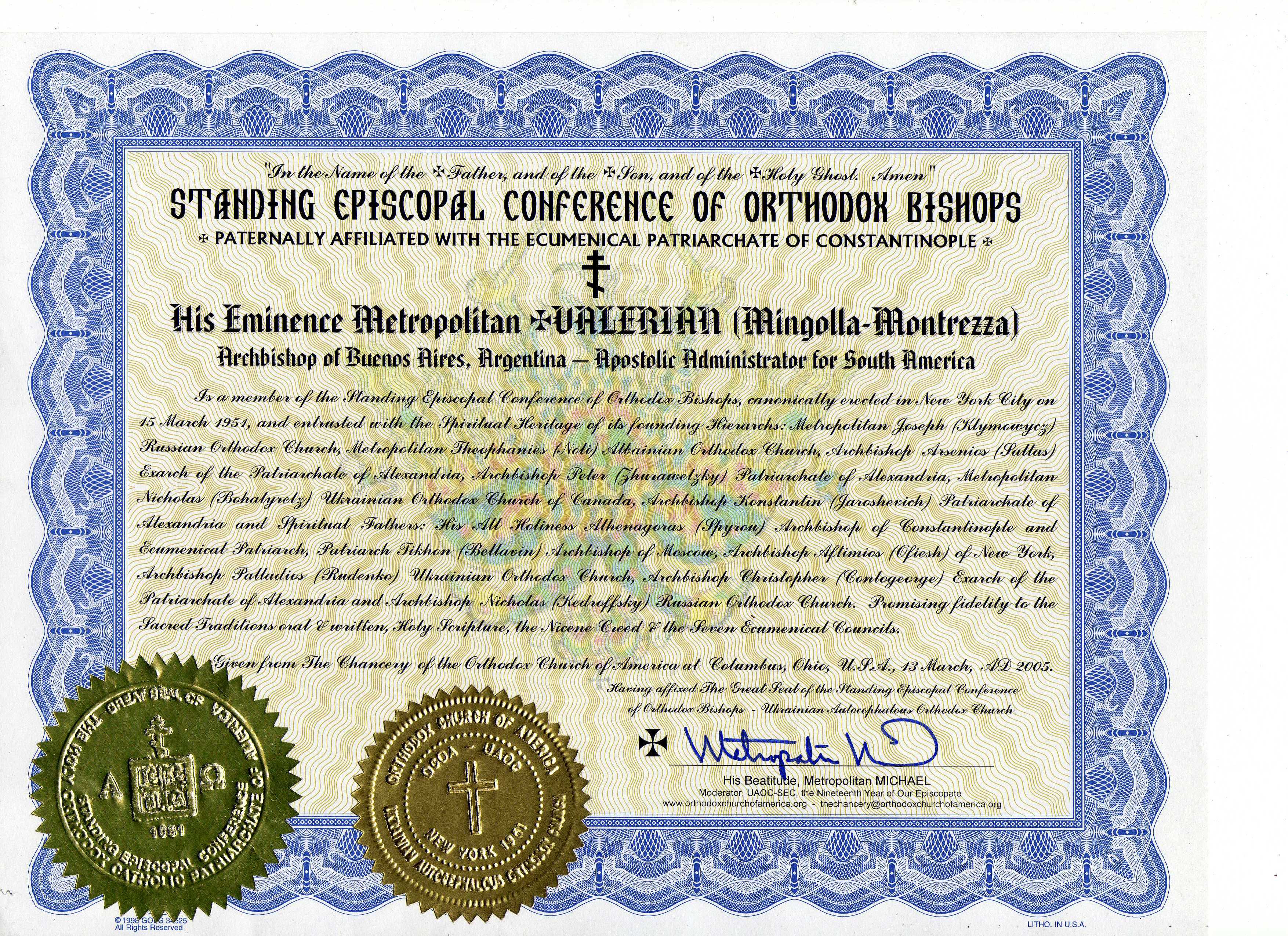 Documento em que S.E.R. Dom Alfredo Mingolla-Montrezza, é nomeado membro da Standing Episcopal Conference of Orthodox Bishops