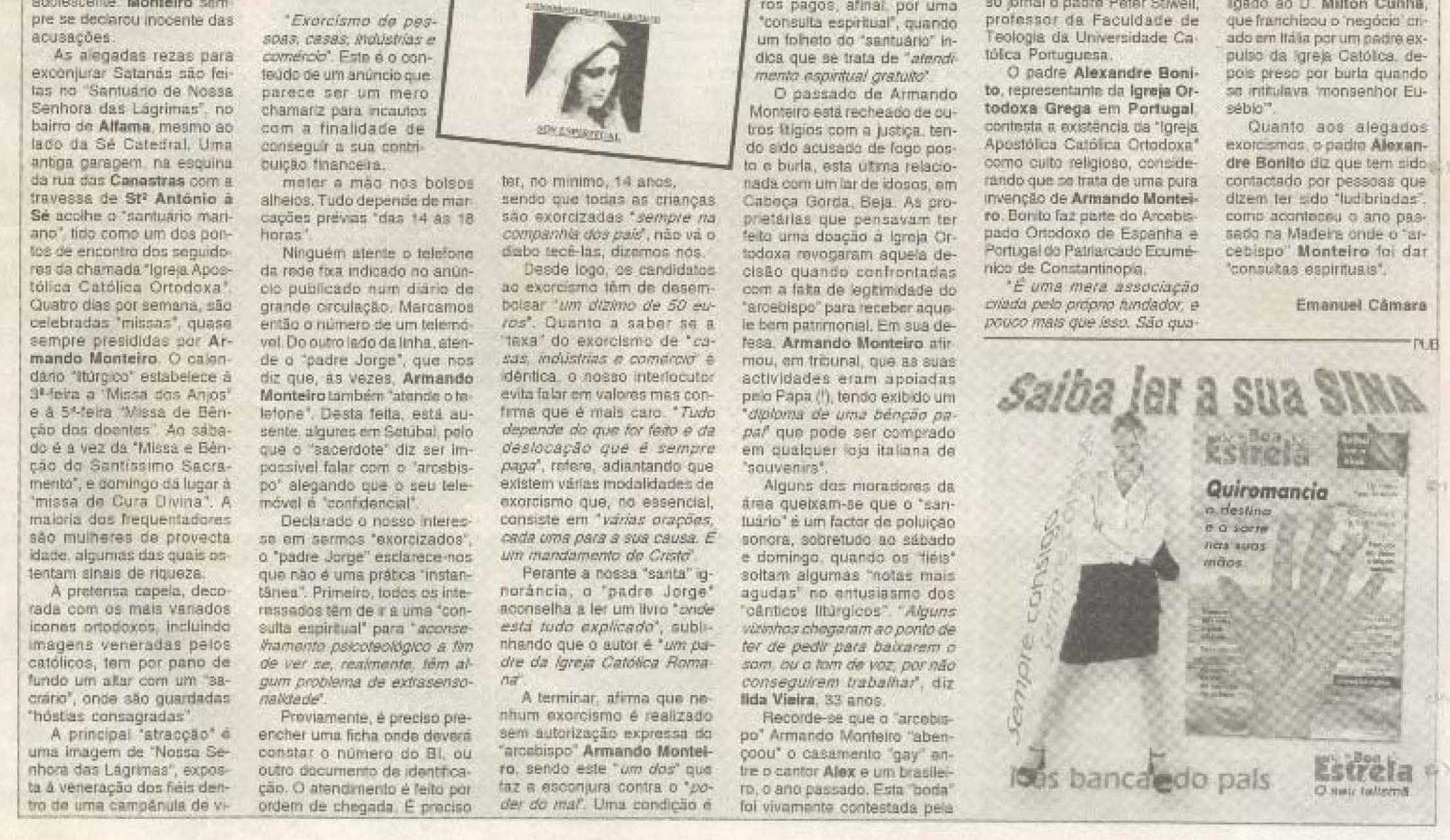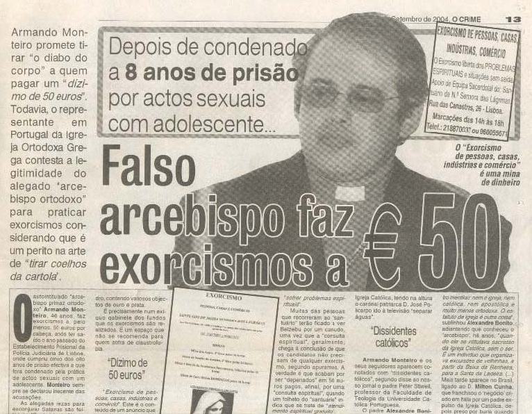 «... O Padre Alexandre Bonito, representante da Igreja Ortodoxa Grega em Portugal, contesta a existência da "Igreja Apostólica Católica Ortodoxa" como culto religioso, considerando que se trata de uma pura invenção de Armando Monteiro. (...) É uma mera associação criada pelo mero fundador, e pouco mais que isso. São quatro mentiras, nem é igreja, nem é católica, nem é apostólica, e muito menos ortodoxa. (...) ...adiantando que conheceu o "arcebispo" há anos, quando ele se intitulava sacristão da Igreja Católica, sem o ser. É um individuo que organizava excurções de velhinhas, a partir da Baixa da Banheira para a Santa da Ladeira. (...) Mais tarde, aparece no Brasil ligado ao D. Milton Cunha... Quanto aos alegados exorcismos, o padre Alexandre Bonito diz que tem sido contactado por pessoas que dizem ter sido "ludibriadas", como aconteceu o ano passado na Madeira, onde o "arcebispo" Monteiro foi dar consultas espirituais».