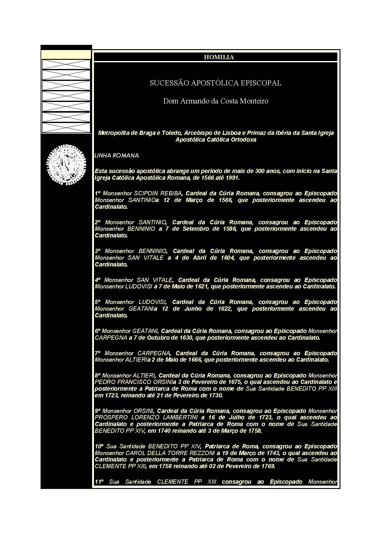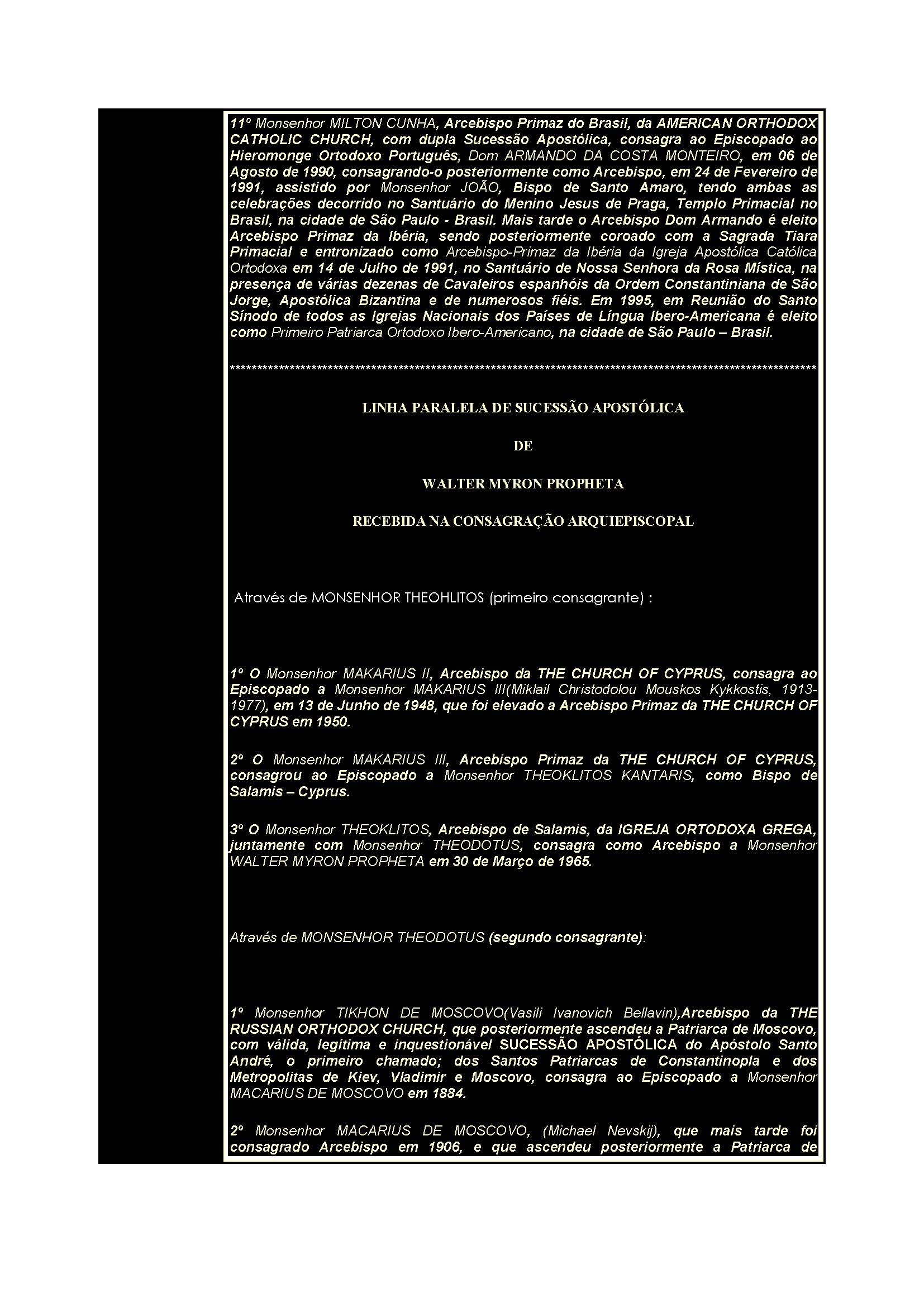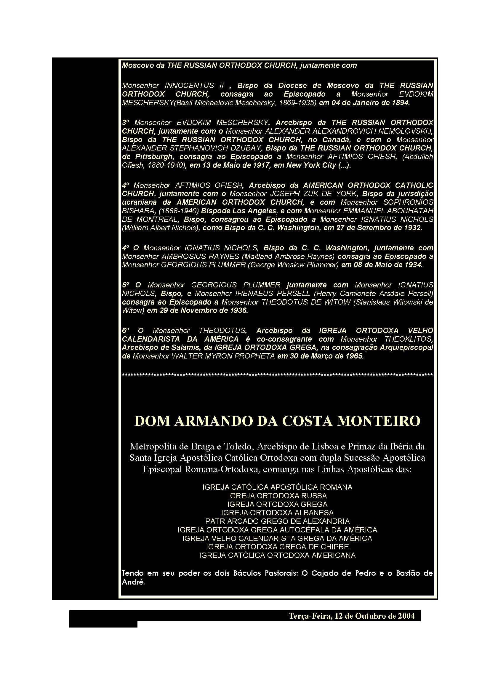 CATHOLIC CHURCH, com dupla Sucessão Apostólica, consagra ao Episcopado ao Hieromonge Ortodoxo Português, Dom ARMANDO DA COSTA MONTEIRO, em 06 de Agosto de 1990, consagrando-o posteriormente como Arcebispo, em 24 de Fevereiro de 1991, assistido por Monsenhor JOÃO, Bispo de Santo Amaro, tendo ambas as celebrações decorrido no Santuário do Menino Jesus de Praga, Templo Primacial no Brasil, na cidade de São Paulo - Brasil. Mais tarde o Arcebispo Dom Armando é eleito Arcebispo Primaz da Ibéria, sendo posteriormente coroado com a Sagrada Tiara Primacial e entronizado como Arcebispo-Primaz da Ibéria da Igreja Apostólica Católica Ortodoxa em 14 de Julho de 1991, no Santuário de Nossa Senhora da Rosa Mística, na presença de várias dezenas de Cavaleiros espanhóis da Ordem Constantiniana de São Jorge, Apostólica Bizantina e de numerosos fiéis. Em 1995, em Reunião do Santo Sínodo de todos as Igrejas Nacionais dos Países de Língua Ibero-Americana é eleito como Primeiro Patriarca Ortodoxo Ibero-Americano, na cidade de São Paulo – Brasil.