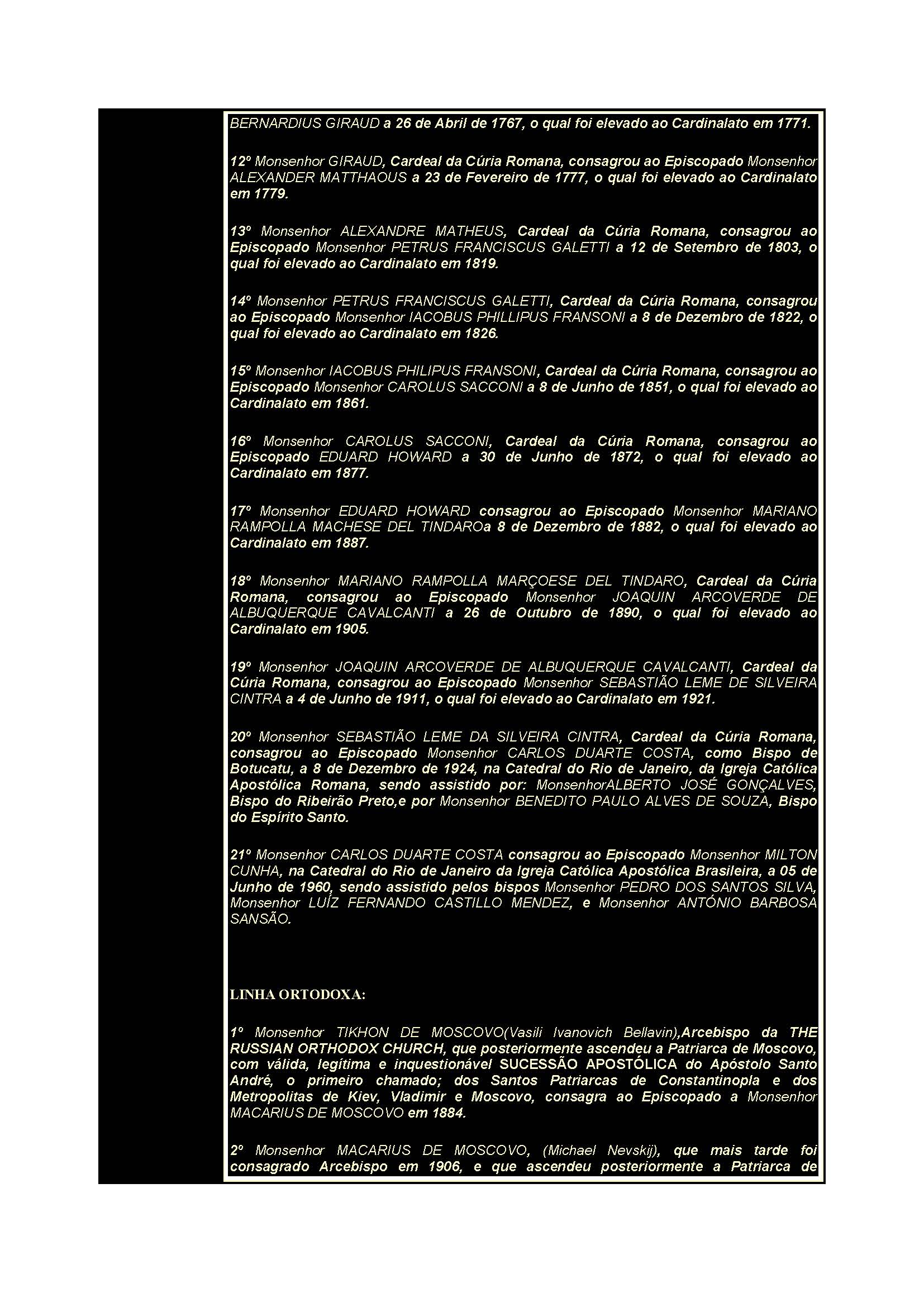 1º Monsenhor TIKHON DE MOSCOVO(Vasili Ivanovich Bellavin),Arcebispo da THE RUSSIAN ORTHODOX CHURCH, que posteriormente ascendeu a Patriarca de Moscovo, com válida, legítima e inquestionável SUCESSÃO APOSTÓLICA do Apóstolo Santo André, o primeiro chamado; dos Santos Patriarcas de Constantinopla e dos Metropolitas de Kiev, Vladimir e Moscovo, consagra ao Episcopado a Monsenhor MACARIUS DE MOSCOVO em 1884.