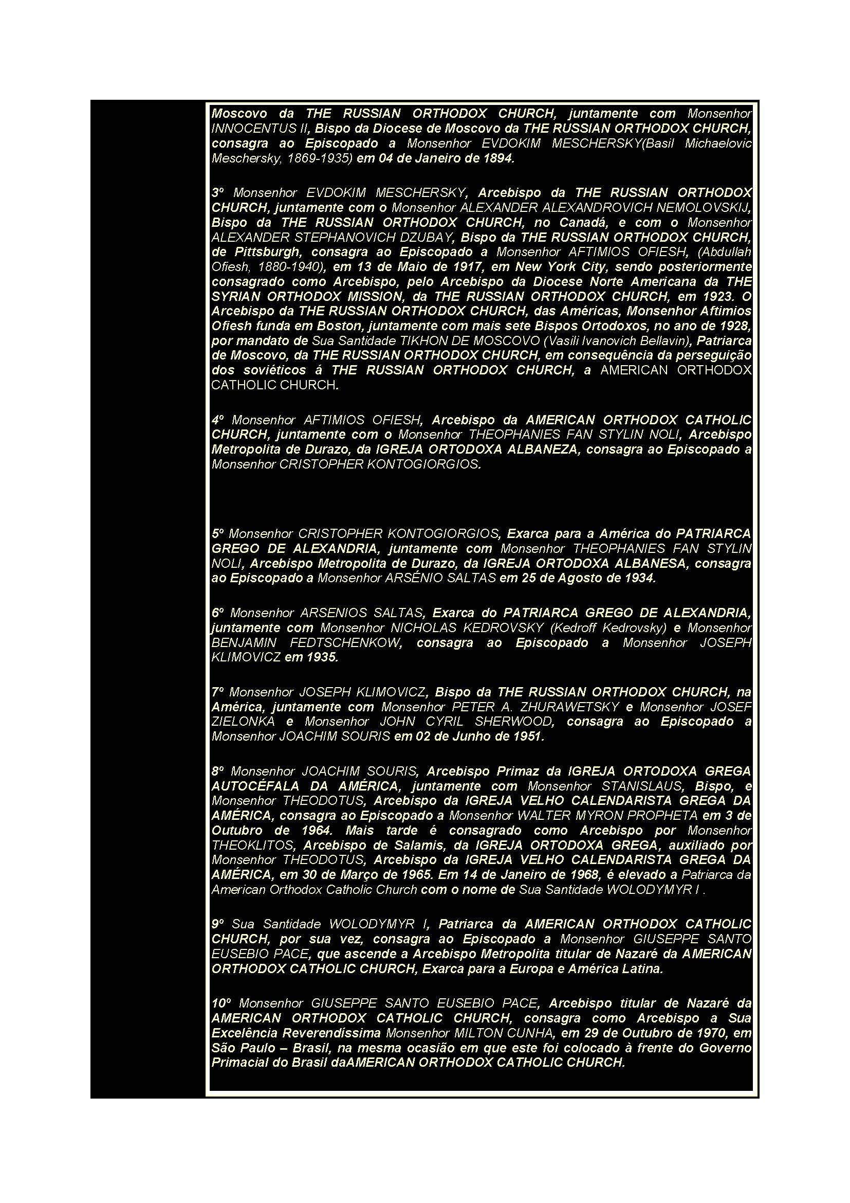 3º Monsenhor EVDOKIM MESCHERSKY, Arcebispo da THE RUSSIAN ORTHODOX CHURCH, juntamente com o Monsenhor ALEXANDER ALEXANDROVICH NEMOLOVSKIJ, Bispo da THE RUSSIAN ORTHODOX CHURCH, no Canadá, e com o Monsenhor ALEXANDER STEPHANOVICH DZUBAY, Bispo da THE RUSSIAN ORTHODOX CHURCH, de Pittsburgh, consagra ao Episcopado a Monsenhor AFTIMIOS OFIESH, (Abdullah Ofiesh, 1880-1940), em 13 de Maio de 1917, em New York City (...).