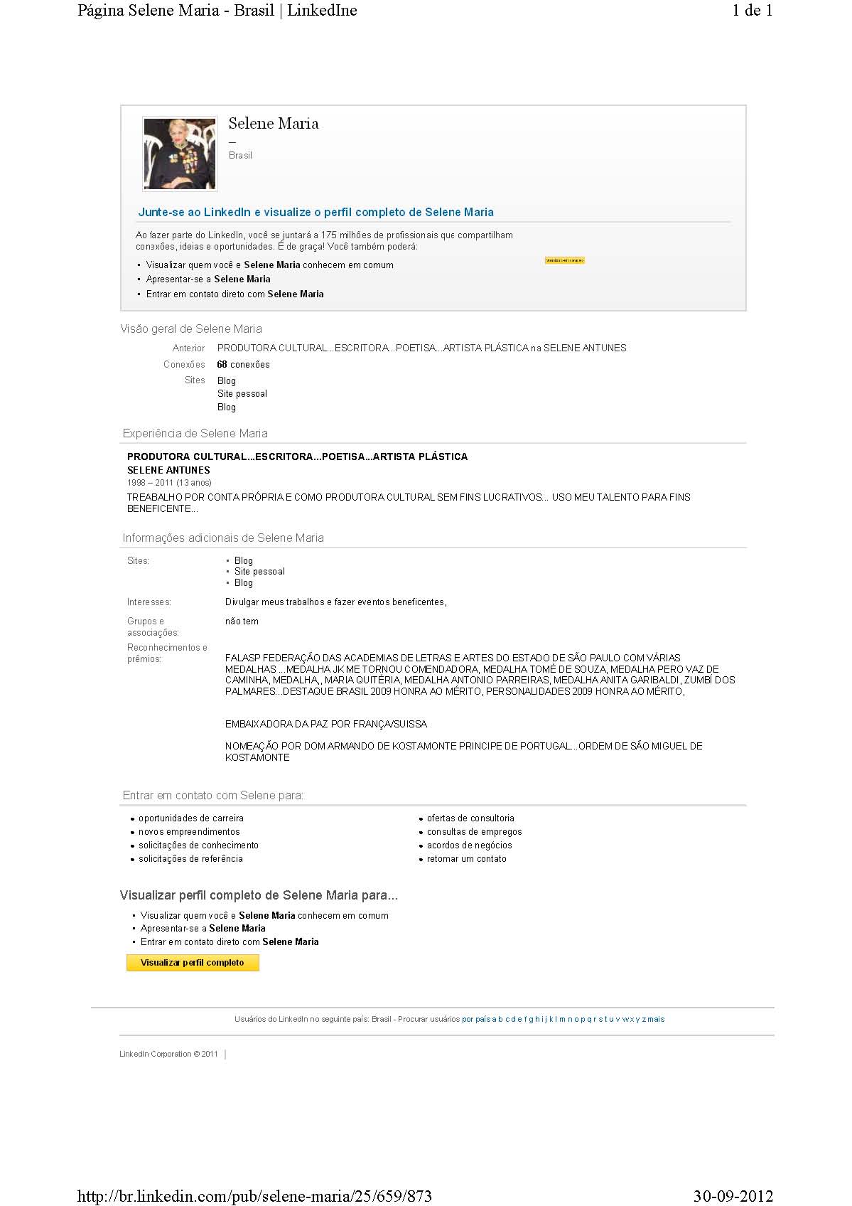 «Selene Maria (...) FALASP FEDERAÇÃO DAS ACADEMIAS DE LETRAS E ARTES DO ESTADO DE SÃO PAULO COM VÁRIAS MEDALHAS ...MEDALHA JK ME TORNOU COMENDADORA, MEDALHA TOMÉ DE SOUZA, MEDALHA PERO VAZ DE CAMINHA, MEDALHA,, MARIA QUITÉRIA, MEDALHA ANTONIO PARREIRAS, MEDALHA ANITA GARIBALDI, ZUMBÍ DOS PALMARES...DESTAQUE BRASIL 2009 HONRA AO MÉRITO, PERSONALIDADES 2009 HONRA AO MÉRITO,