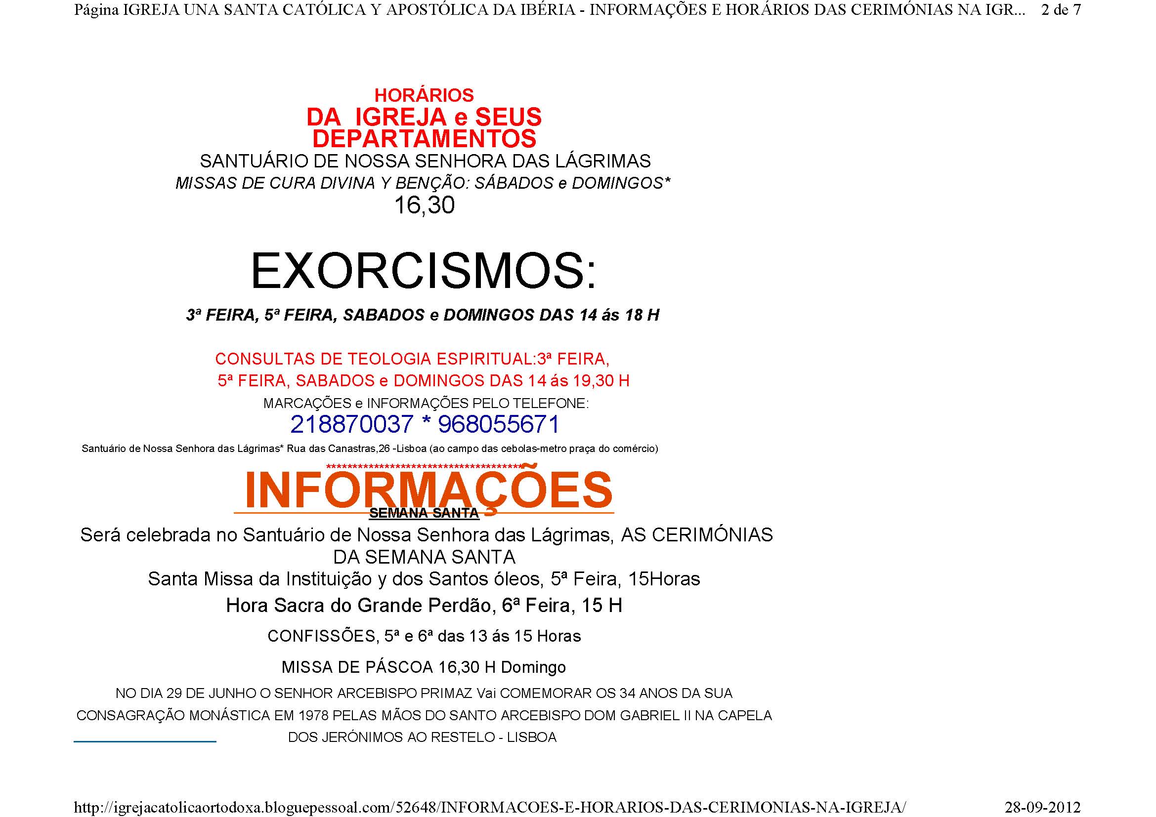«INFORMAÇÕES E HORÁRIOS DAS CERIMÓNIAS NA IGREJA