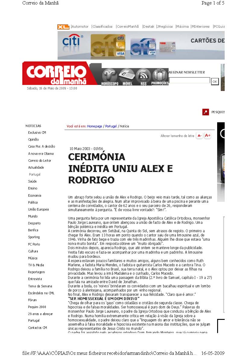 Uma pergunta feita por um representante da Igreja Apostólica Católica Ortodoxa, monsenhor Paulo Jorge Laureano, que ontem abençoou a união de facto de Alex e de Rodrigo. Uma bênção polémica e inédita em Portugal.