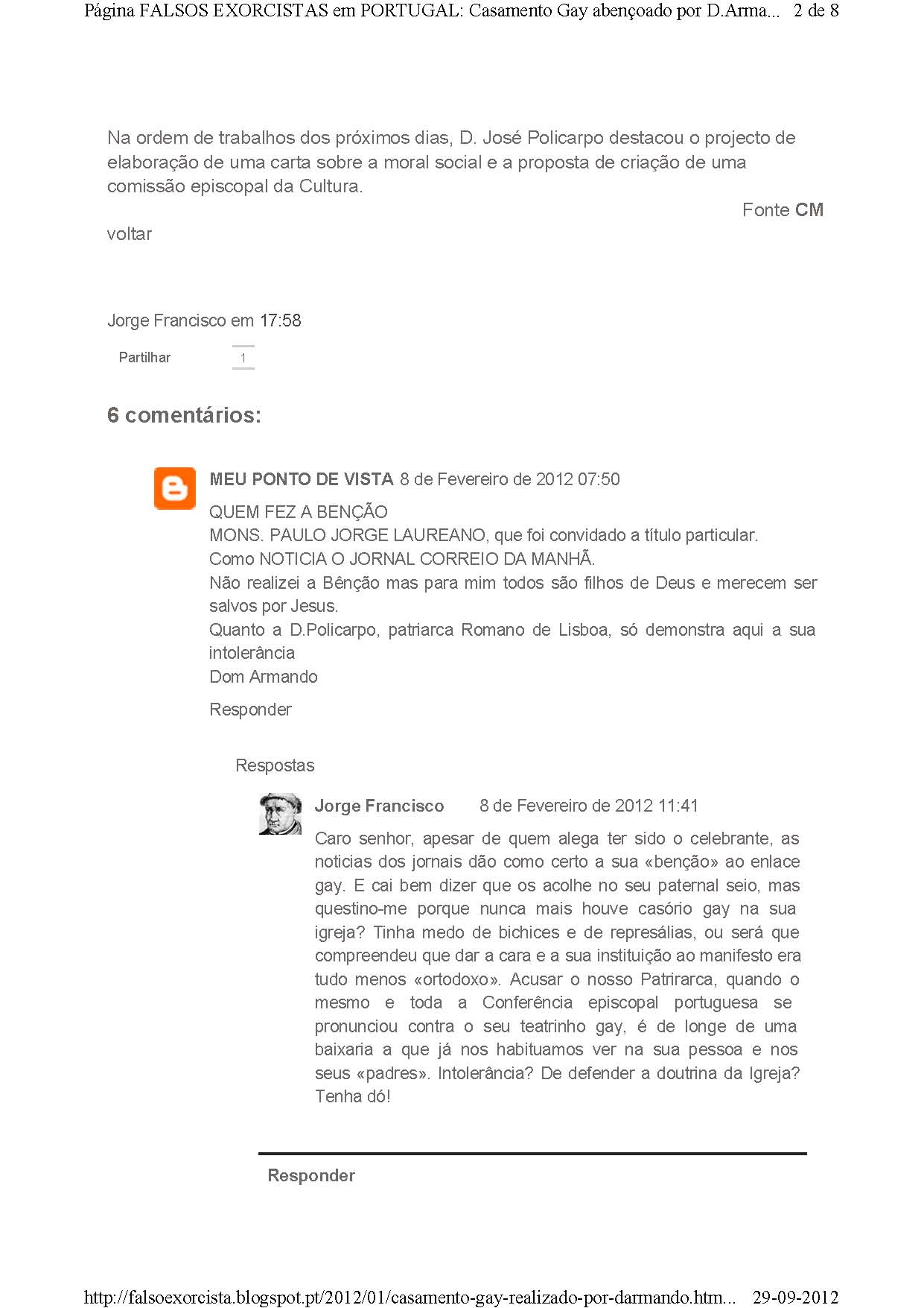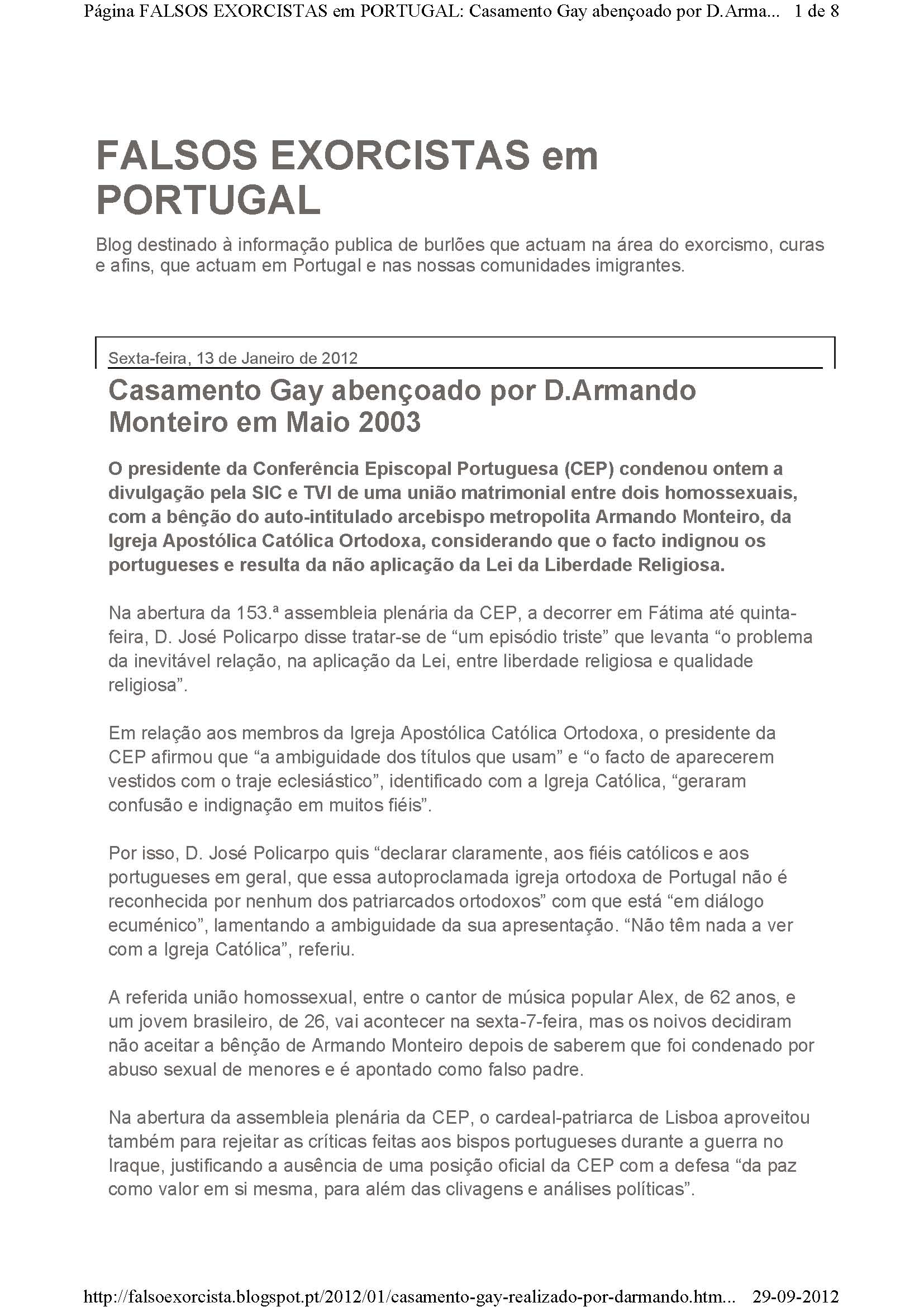 O presidente da Conferência Episcopal Portuguesa (CEP) condenou ontem a divulgação pela SIC e TVI de uma união matrimonial entre dois homossexuais, com a bênção do auto-intitulado arcebispo metropolita Armando Monteiro, da Igreja Apostólica Católica Ortodoxa, considerando que o facto indignou os portugueses e resulta da não aplicação da Lei da Liberdade Religiosa.