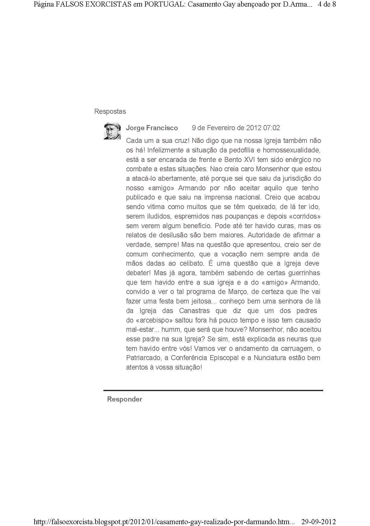 A referida união homossexual, entre o cantor de música popular Alex, de 62 anos, e um jovem brasileiro, de 26, vai acontecer na sexta-7-feira, mas os noivos decidiram não aceitar a bênção de Armando Monteiro depois de saberem que foi condenado por abuso sexual de menores e é apontado como falso padre.