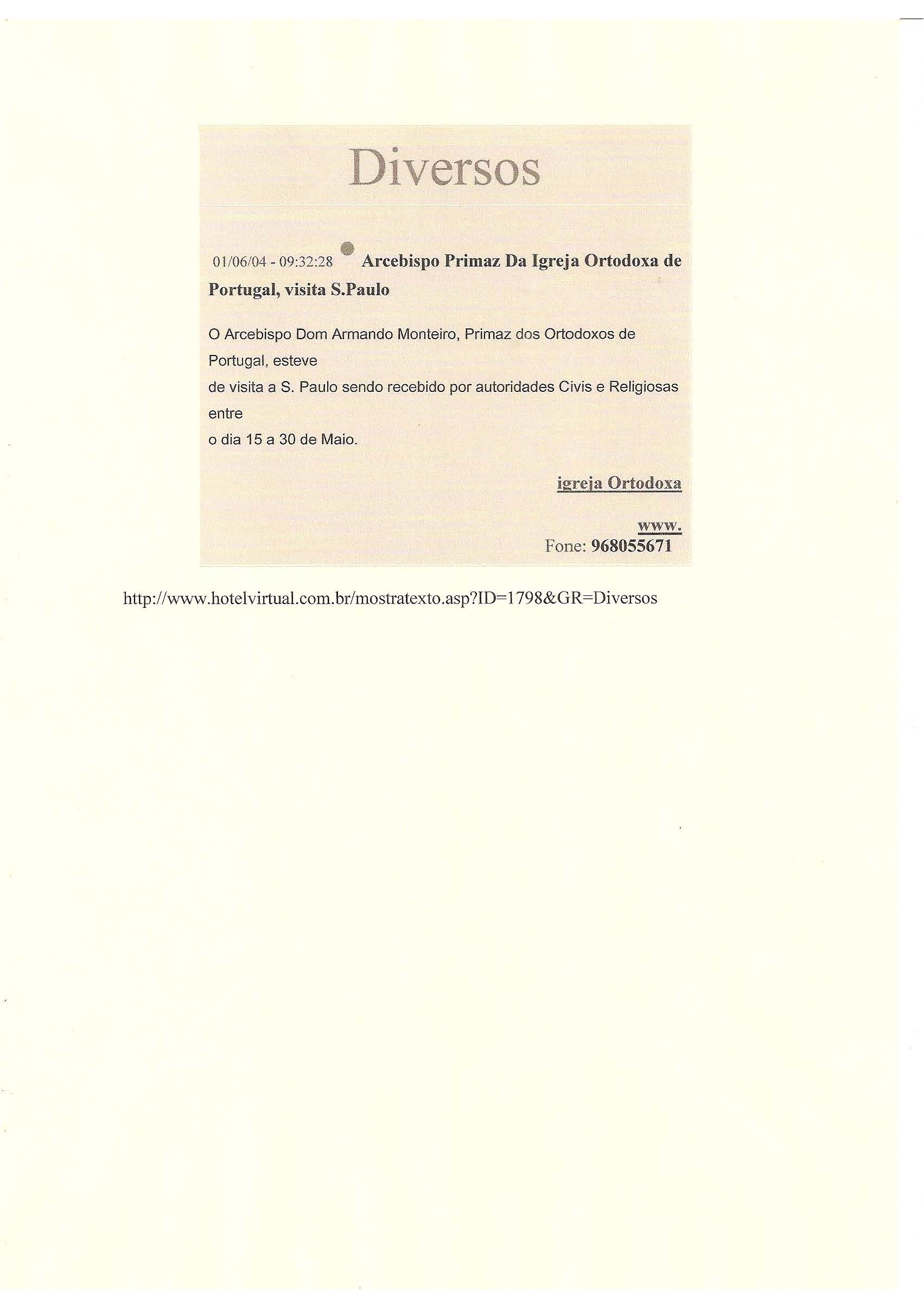 «O Arcebispo Dom Armando Monteiro, Primaz dos Ortodoxos de Portugal, esteve de visita a S. Paulo sendo recebido por autoridades Civis e Religiosas entre o dia 15 e 30 de Maio»