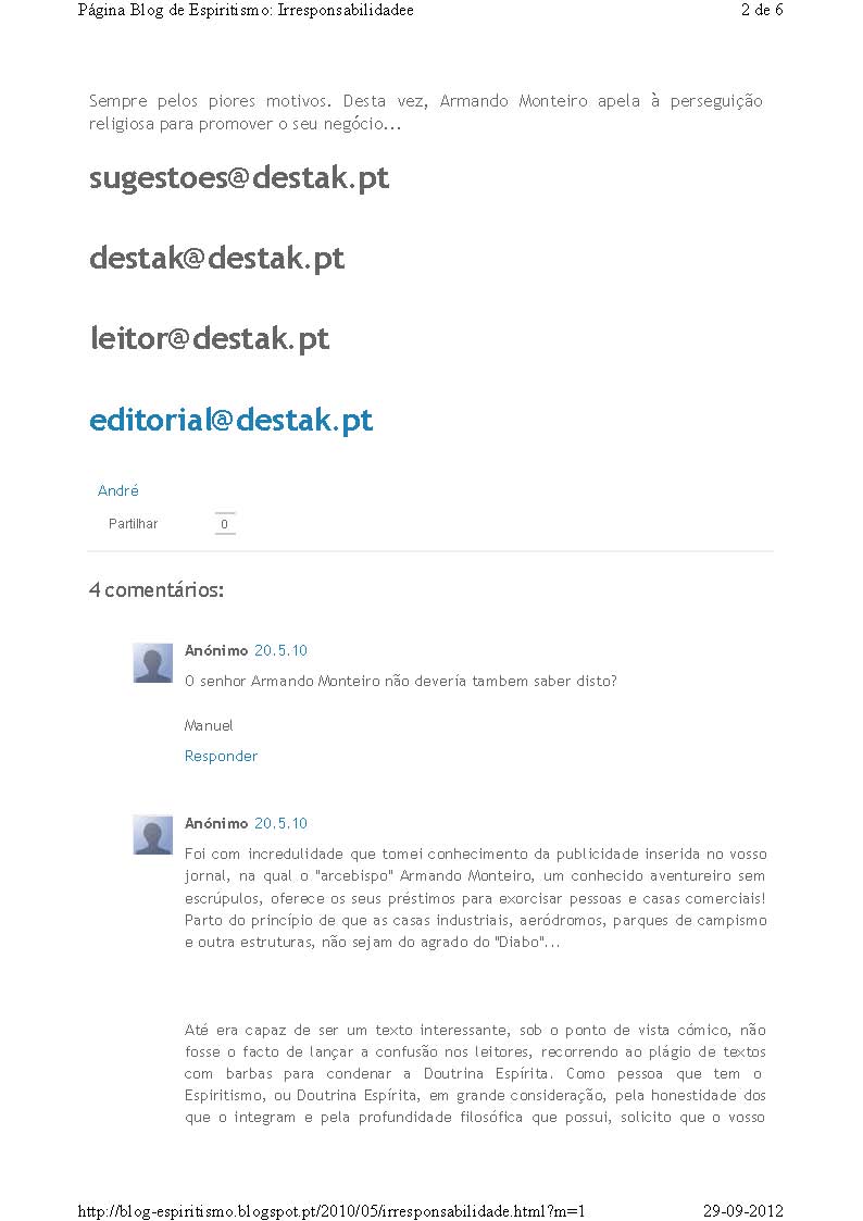 «Será o D. Armando Monteiro que assina o texto citado neste post, inserido no jornal Destak, o conhecido Armando Monteiro, o mesmo que se intitula Arcebispo Metropolita da Igreja Ortodoxa Portuguesa? Será o que fundou a denominada Igreja Católica Ortodoxa Portuguesa, em 1990? Será o senhor que aparece na imagem?