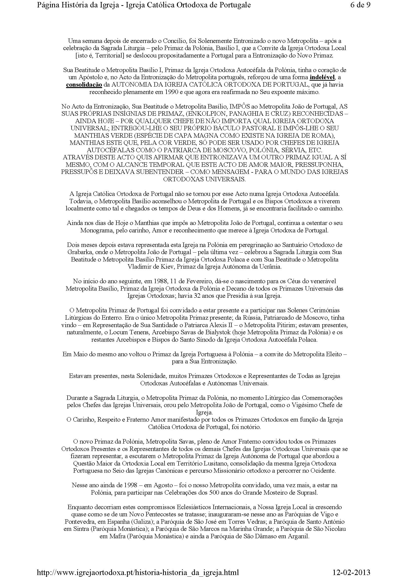 Sua Beatitude o Metropolita Basílio I, Primaz da Igreja Ortodoxa Autocéfala da Polónia, tinha o coração de um Apóstolo e, no Acto da Entronização do Metropolita português, reforçou de uma forma indelével, a consolidação da AUTONOMIA DA IGREJA CATÓLICA ORTODOXA DE PORTUGAL, que já havia reconhecido plenamente em 1990 e que agora era reafirmada no Seu expoente máximo.