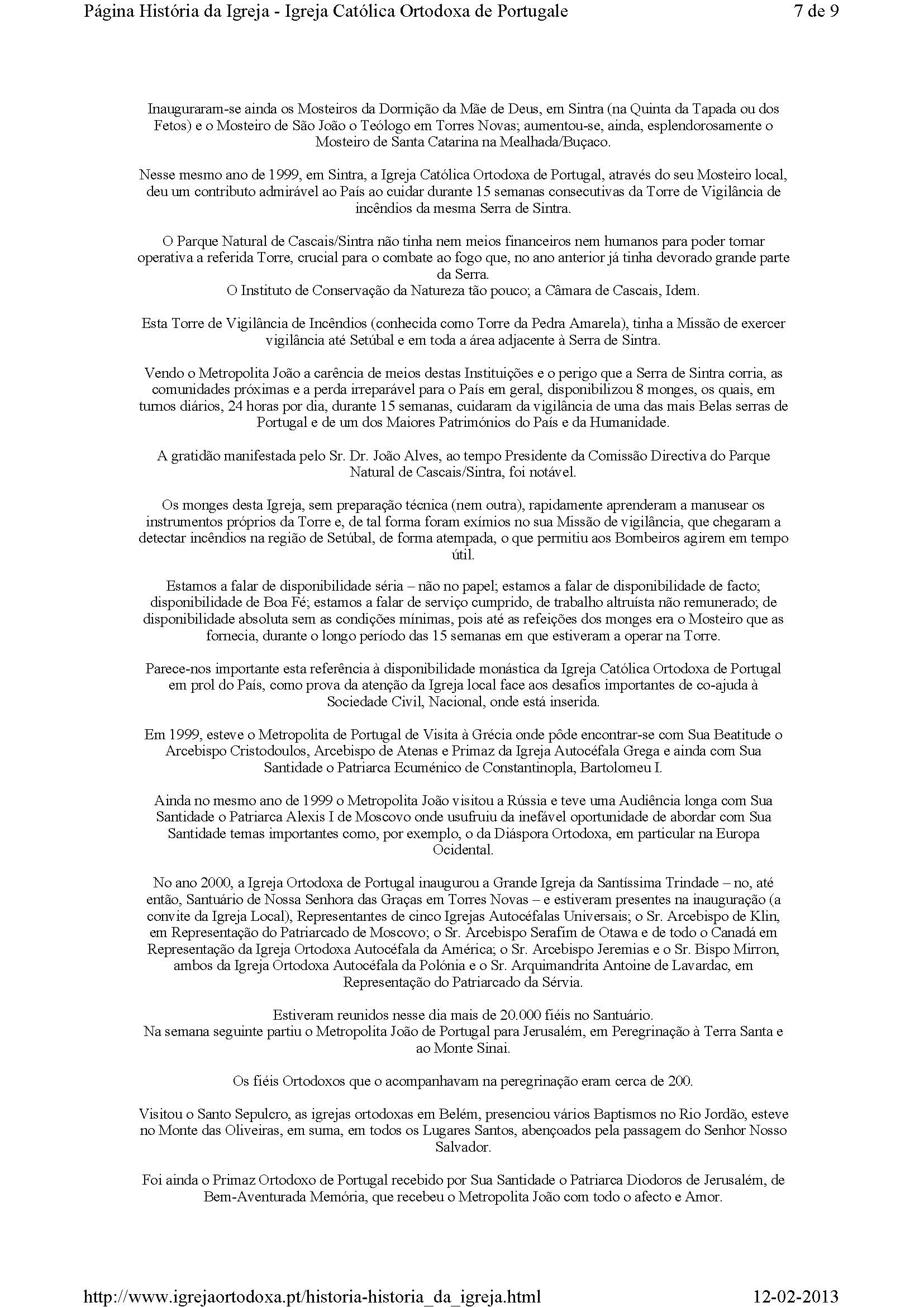 Nesse mesmo ano de 1999, em Sintra, a Igreja Católica Ortodoxa de Portugal, através do seu Mosteiro local, deu um contributo admirável ao País ao cuidar durante 15 semanas consecutivas da Torre de Vigilância de incêndios da mesma Serra de Sintra.