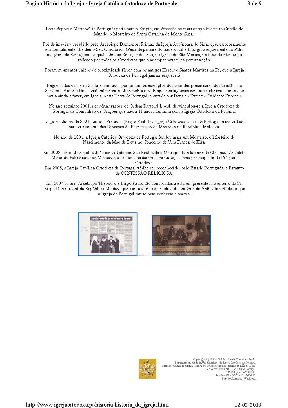 Em 2006, a Igreja Católica Ortodoxa de Portugal vê-lhe ser reconhecido, pelo Estado Português, o Estatuto de CONFISSÃO RELIGIOSA;
