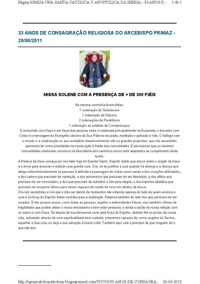 «33 ANOS DE CONSAGRAÇÃO RELIGIOSA DO ARCEBISPO PRIMAZ -