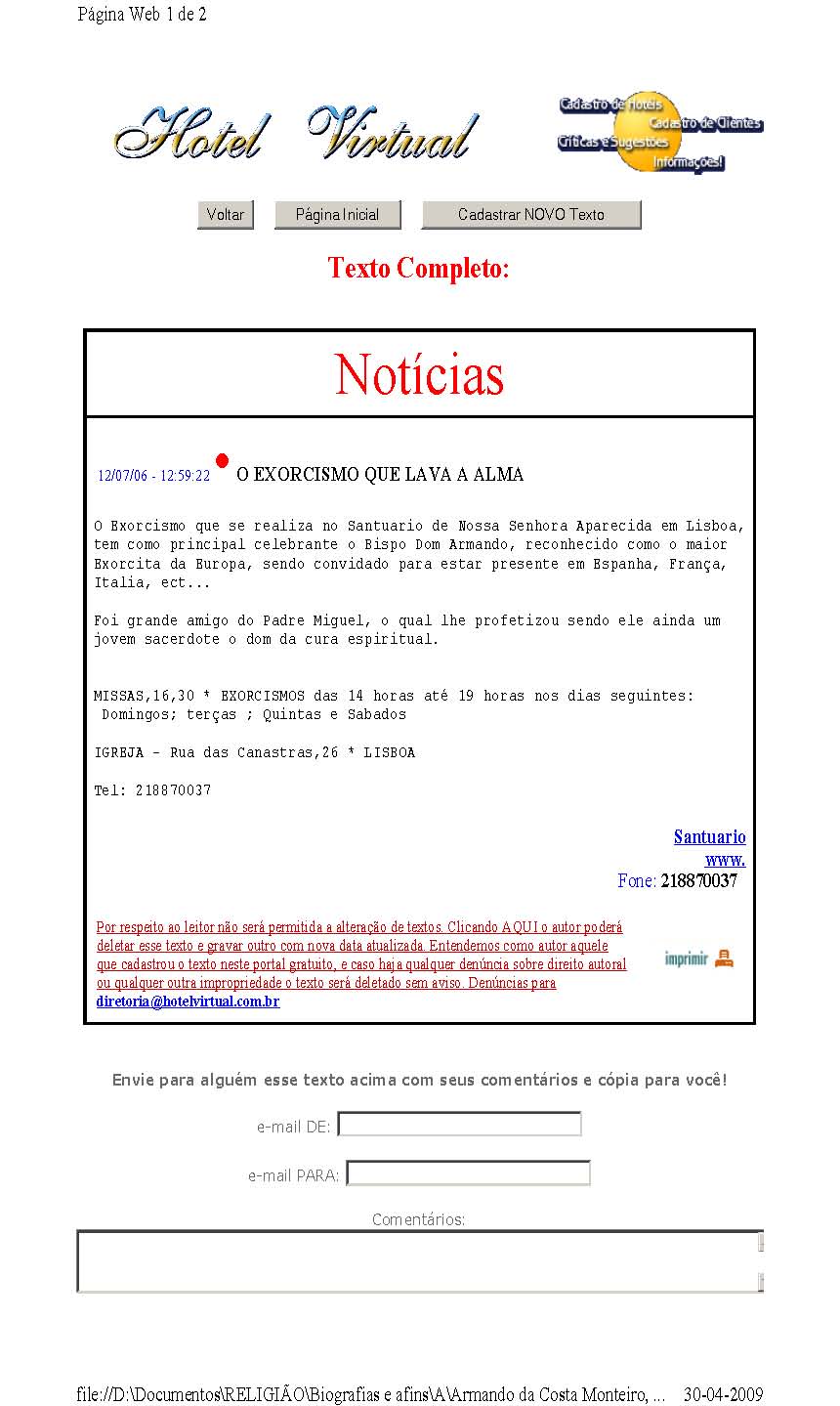 MISSAS,16,30 * EXORCISMOS das 14 horas até 19 horas nos dias seguintes: