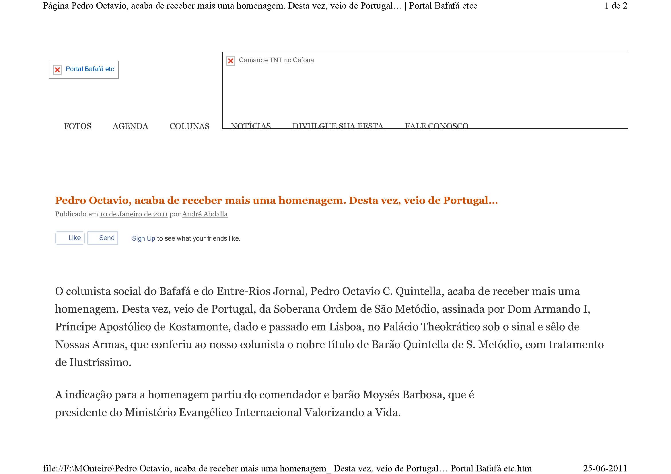 Nossas Armas, que conferiu ao nosso colunista o nobre título de Barão Quintella de S. Metódio, com tratamento