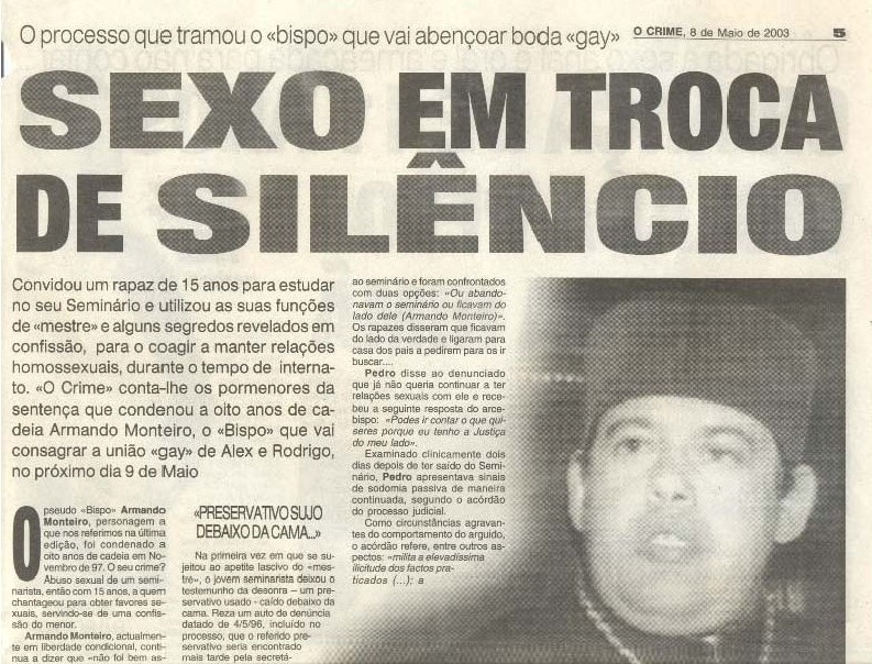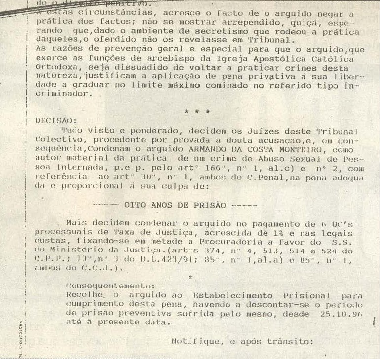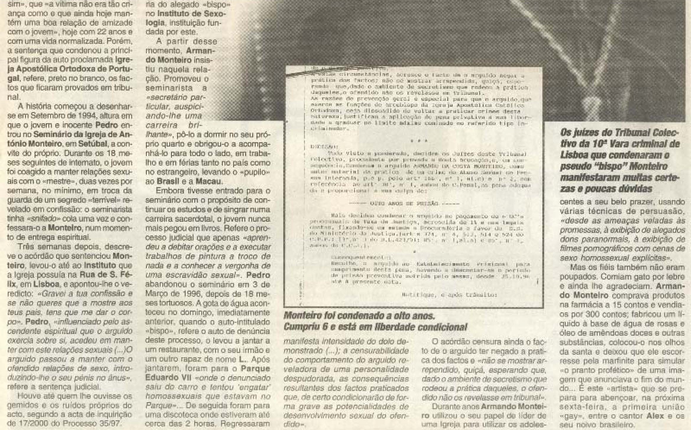 O pseudo «Bispo» Armando Monteiro, personagem a que nos referimos na última edição, foi condenado a oito anos de cadeia em Novembro de 97. O seu crime? Abuso sexual de um seminarista, então com 15 anos, a quem chantageou para obter favores sexuais, servindo-se de uma confissão do menor.