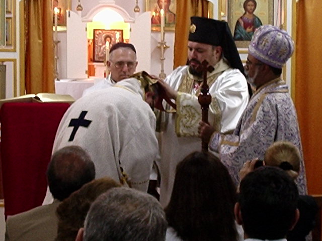 Sua Emª Rev.ma Mgr. Alfredo recebendo a imposição de mãos de S.B Mgr. Alejandro Dalochio, sob o olhar atento do Sagrante Principal S.B. Dom Luiz António do Nascimento (Mar Athanasios I) e do Co-Consagrante Sua Exªa Rev.ma Mgr. Óscar Arnedo Camino