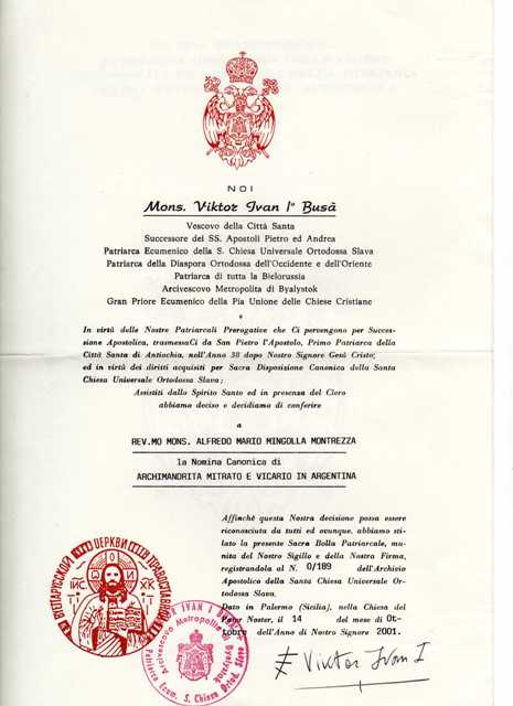Mar Athanasios I, aonde confirma a Mgr. Alfredo Mario Mingolla Montrezza