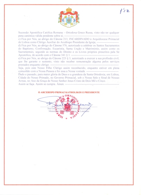 Fé Ortodoxa, tendo vindo a receber a Sagrada Ordenação