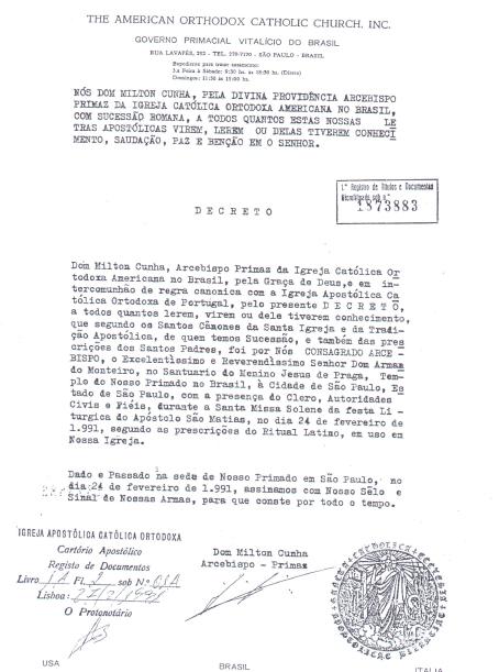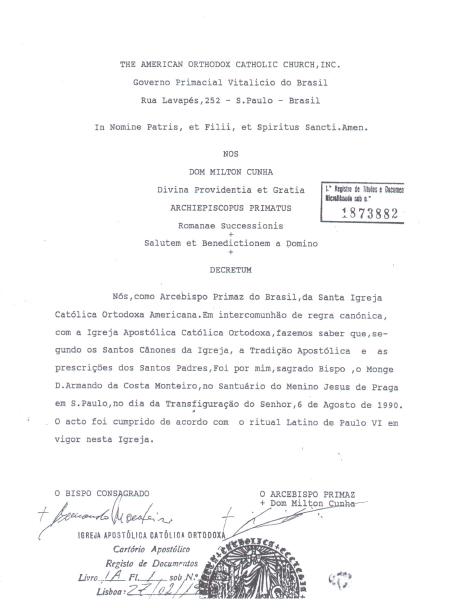 posteriormente o nome da associação religiosa para - Igreja Apostólica Católica Ortodoxa -, pouco antes de receber a Sagrada Ordenação Episcopal em 06 de Agosto de 1990, em São Paulo, Brasil, das mãos