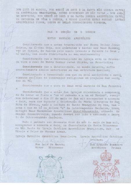 Em 22 de Março de 1992, na Cidade de São Paulo, Brasil, assinou o acordo de Intercomunhão entre a Igreja Apostólica Católica Ortodoxa e a Diocese de São Paulo da Igreja Católica Apostólica Brasileira, na pessoa de Sua Exª Rev.ma D. Luis de Marchi.