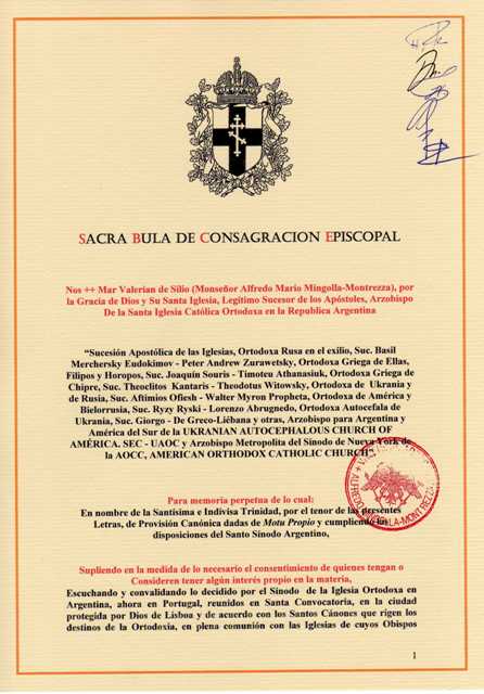 Em 07 de Fevereiro de 2009, recebe a Sagrada Ordenação Episcopal para a Igreja Católica Ortodoxa na República Argentina, sob o Santo Sínodo dos Estados Unidos da América, das mãos de Sua Exª Rev.ma Mar Valerian de Silio (Alfredo Mário Mingolla-Montrezza), e tendo como Co-Consagrantes: S.B. Mar Alexander I da Hispânea (Paulo Jorge de Laureano – Vieira y Saragoça), Arcebispo Primaz Katholikos e Presidente da Igreja Católica Ortodoxa Hispânica; S.B. Dom Delberto Constantino Araújo de Aguiar, Arcebispo de Lisboa e Vigário Geral da Igreja Apostólica Luso-Hispânica; Sua Exª Rev.ma Dom Luís Manuel dos Reis Gonçalves, Arcebispo Titular da Lusitânia e Vigário Geral da Igreja Universal Ortodoxa Eslava; e por Sr. Fernão Manuel Marques Gomes, então Arcebispo Titular de Tarso e Vigário Primacial da Igreja Católica Ortodoxa Hispânica (1). Em tão grande acto estiveram presentes SS.AA.RR.II. os Príncipes de Septimio-Bathzabbay El Tadmur.