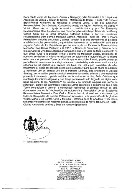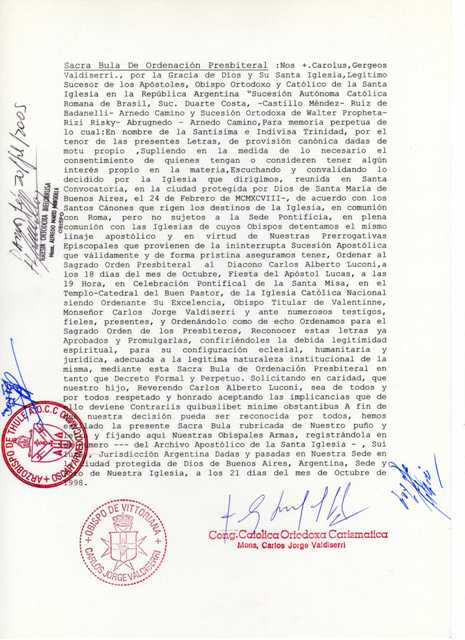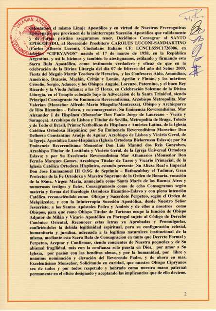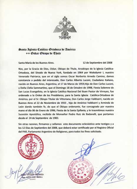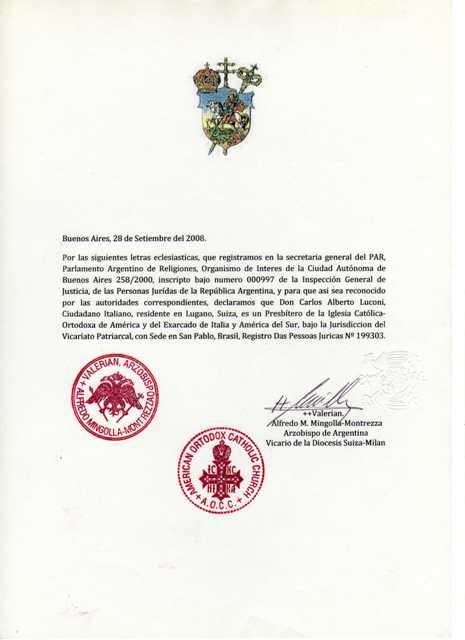 Sua Exª Rev.ma Mgr. Carlos Alberto Luconi, é cidadão italiano, nascido em Buenos Aires, na República Argentina, em 17 de Março de 1958, sendo filho de Dom Carlos Luconi, e de Dona Clelia Sammartino. Casado e pai de vários filhos, veio a receber a Sagrada Ordenação Presbiteral para a Igreja Católica Ortodoxa da América, em 18 de Outubro de 1998, Festa Litúrgica de São Lucas Evangelista, das mãos de Sua Exª Rev.ma Mgr. Carlos Jorge Valdiserri, Bispo Titular de Vittoriana.