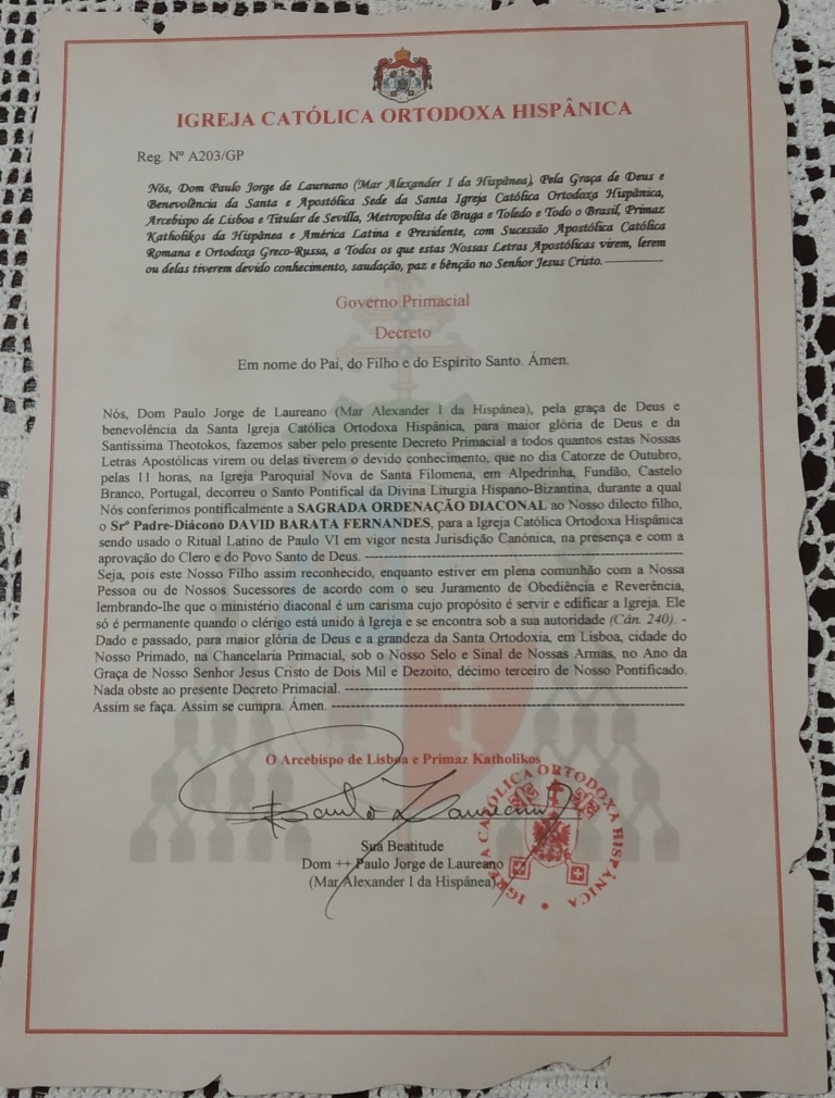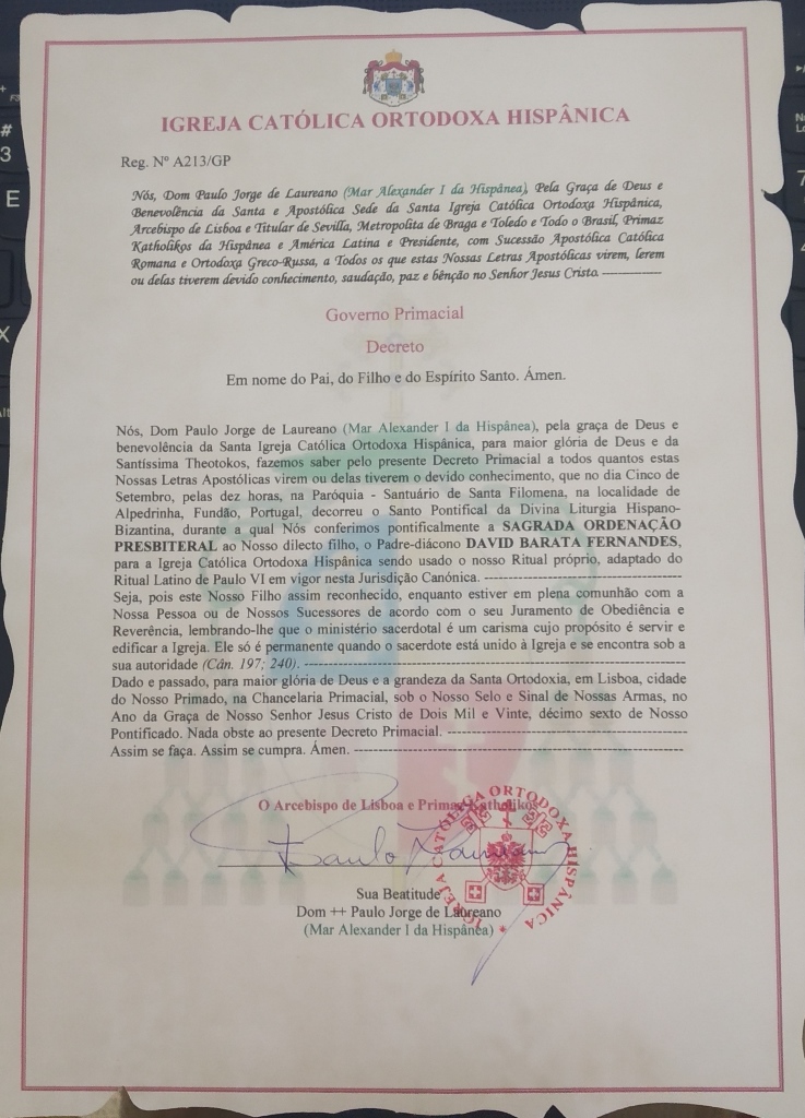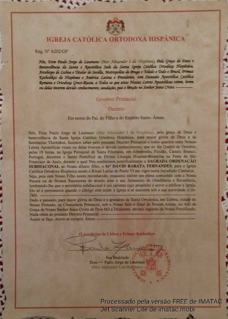 O Rev.do Pe. David Barata Fernandes, fez a sua admissão e caminhada vocacional na Igreja, tendo recebido na Capela de Santa Filomena o Santo Sacramento do Crisma em 04 de Outubro de 2017, das mãos de S.B. Dom Paulo Jorge de Laureano, Arcebispo de Lisboa e Primaz Katholikos da Igreja Católica Ortodoxa Hispânica, após o qual recebeu a Sagrada Ordenação Subdiaconal na Igreja de Nossa Senhora da Saúde, no Santuário de Santa Filomena, em Alpedrinha, tendo na celebração a presença do Pároco da Paróquia-Santuário de Santa Filomena, Revº Pe. César Barata, e o Revº Pe. Diác. Marco Roxo.