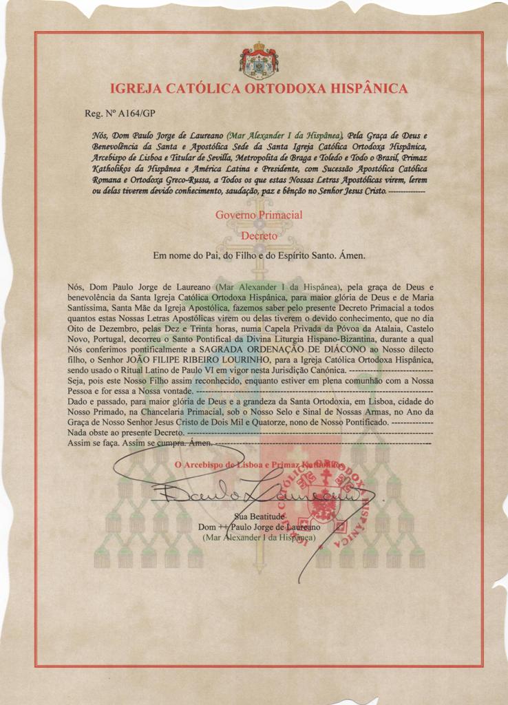Em 08 de Dezembro de 2014, recebe a Sagrada Ordenação Diaconal, pelas mãos de S.B. Dom Paulo Jorge de Laureano, Arcebispo de Lisboa e Primaz Katholikos, na Póvoa da Atalaia, sendo concelebrante o Revº Pe. César Barata.