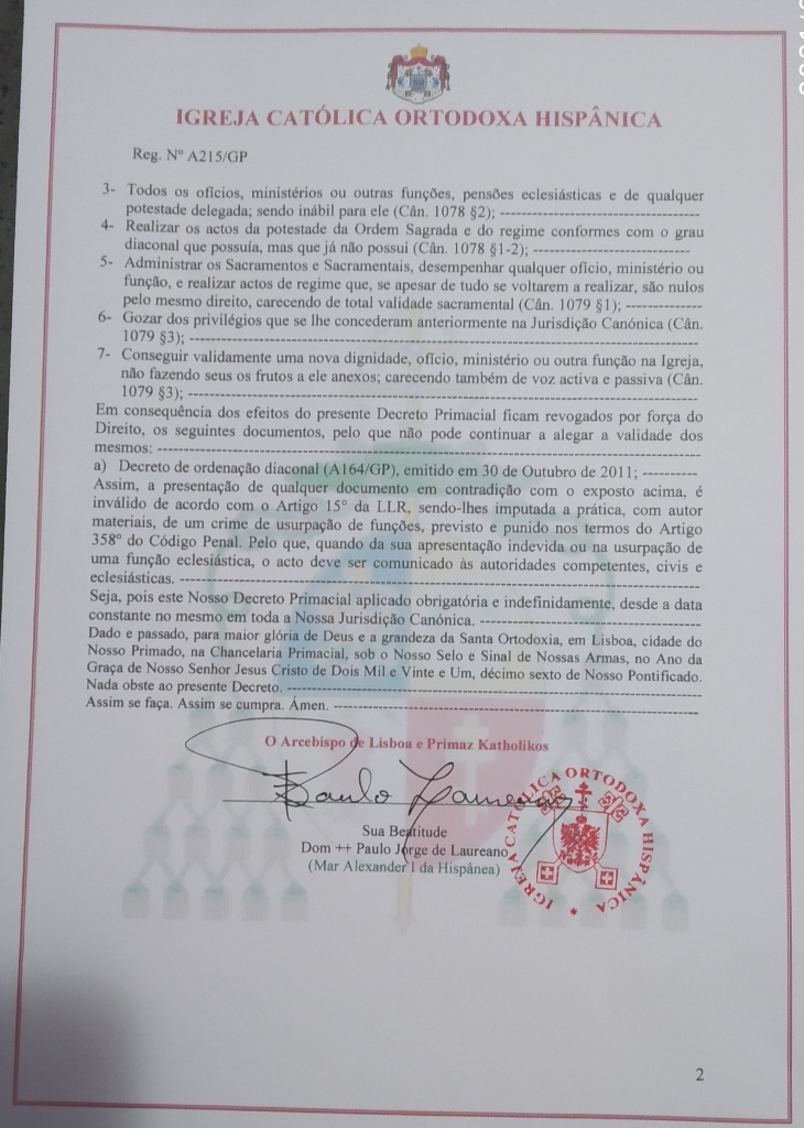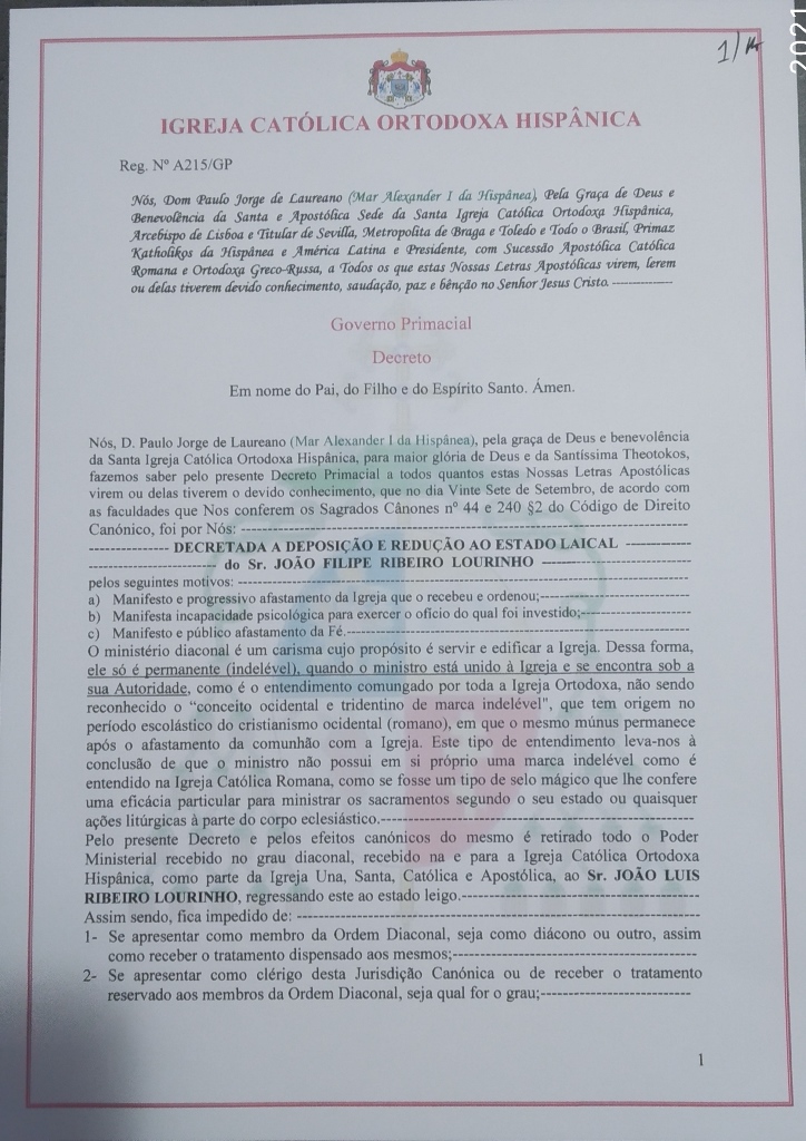 Em 27 de Setembro de 2021, S.B. Dom Paulo decretou a sua Deposição e Redução ao Estado Laical.