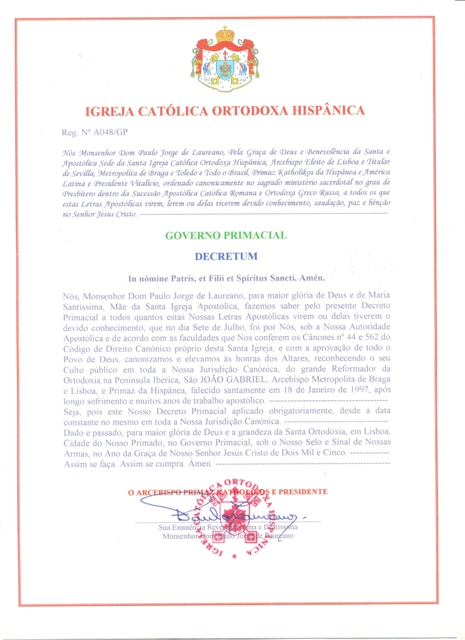 e não aos italianos ou residentes em Itália. Então, S.B. Dom João Gabriel abandona a sua Primazia dentro da Metrópole Ortodoxa