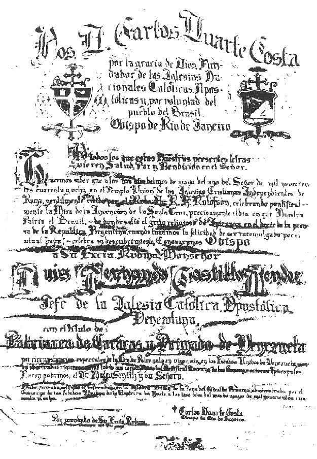 Em 08 de Março de 1947, Sua Emª Rev.ma D. Luis Fernando Castillo Mendez, junto com outros três clérigos, deixou a Igreja Católica Apostólica Romana e a Arquidiocese de Caracas, Venezuela, para fundar a Igreja Católica Apostólica da Venezuela.