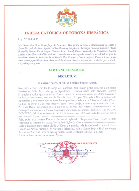 Foi canonizado e elevado às honras dos Altares, em toda a nossa Jurisdição Canónica, pelo Decreto Primacial A047/GP, de 06 de Julho de 2005.