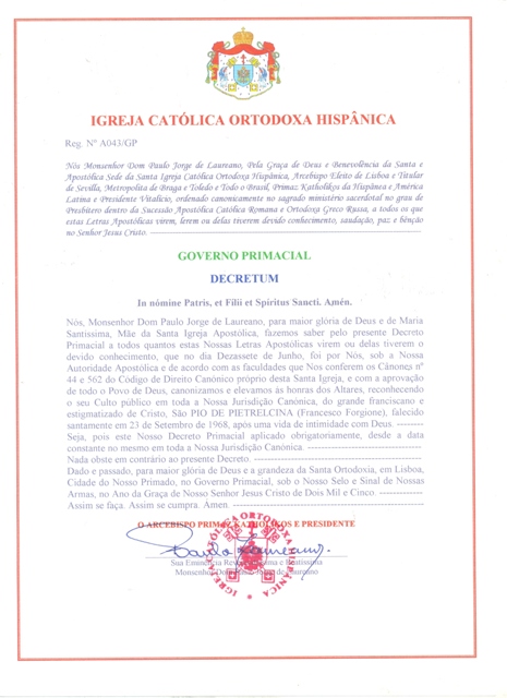 Deste maravilhoso frei, escolhido pro Deus para derramar a sua Divina Misericórdia de uma maneira especial. Foi canonizado e elevado às honras dos Altares, em toda a nossa Jurisdição Canónica, pelo Decreto Primacial A043/GP, de 17 de Junho de 2005.