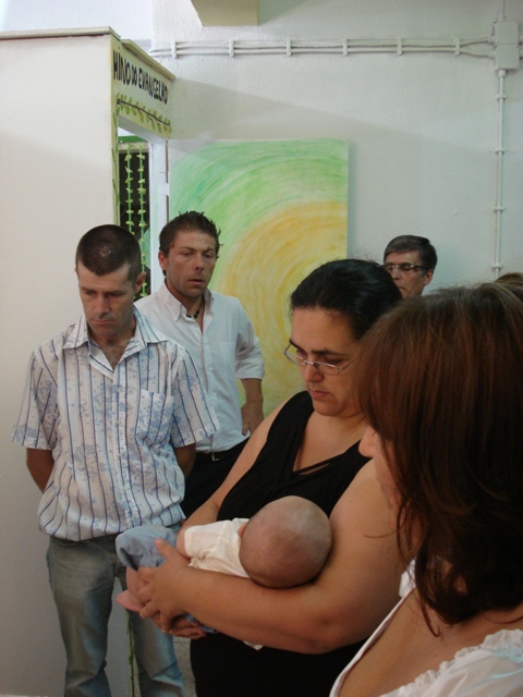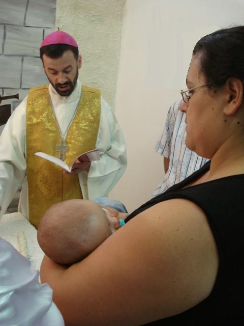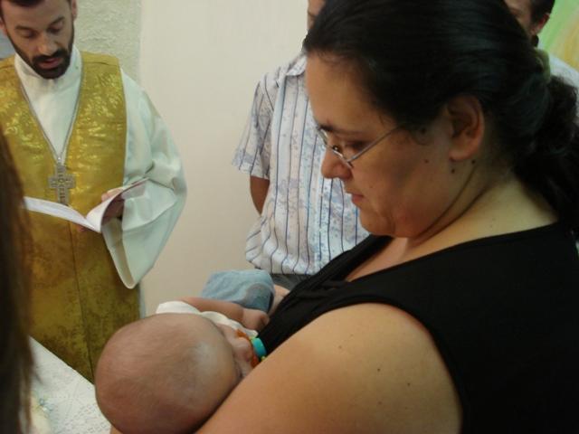 A mãe do pequeno André fazendo o sinal da cruz de Cristo na testa de seu filho