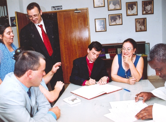 S.B. Dom Paulo Jorge de Laureano a assinar o livro de assentos de Matrimónio, sob o olhar atento dos recém-casados, da madrinha da noiva, e dos padrinhos de batismo do pequeno Bruno