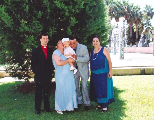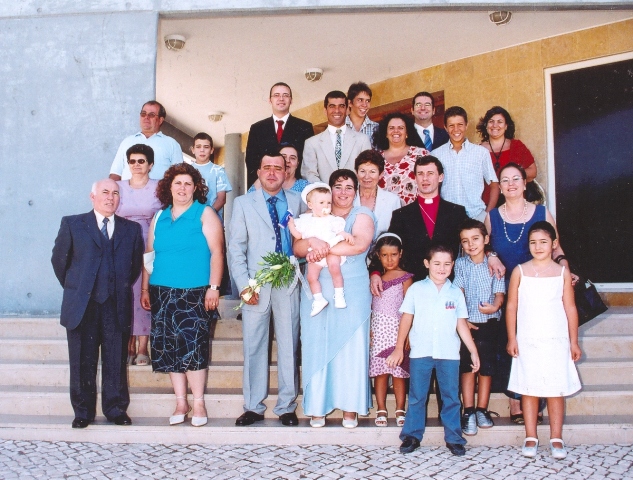 S.B. Dom Paulo Jorge de Laureano, juntamente com a madrinha da noiva, a srª dª Maria Clementina das Neves Lameiro, com os noivos e o pequeno Bruno