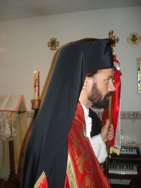 S.B. Dom Paulo Jorge de Laureano saindo no início da procissão eucarística na companhia do padre Humberto Jorge Pereira Rolo, prior da Comunidade